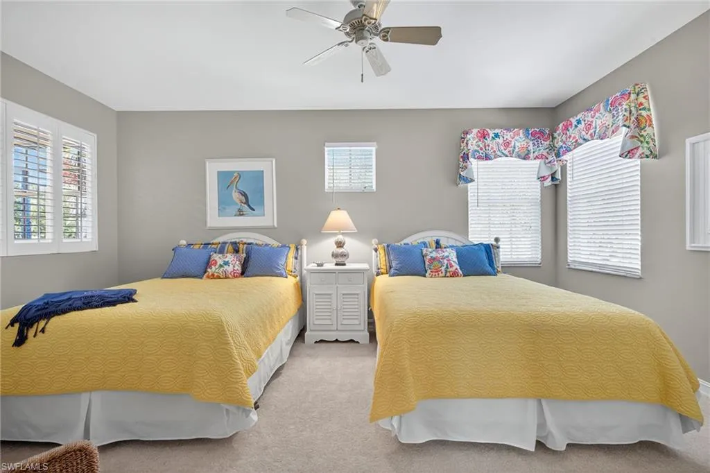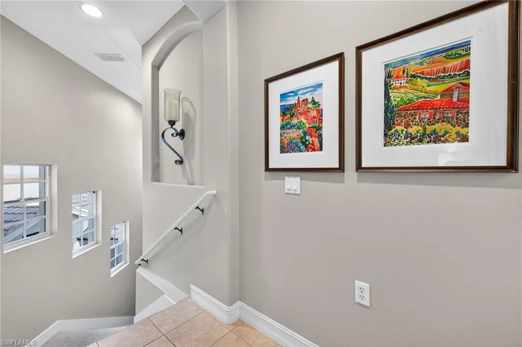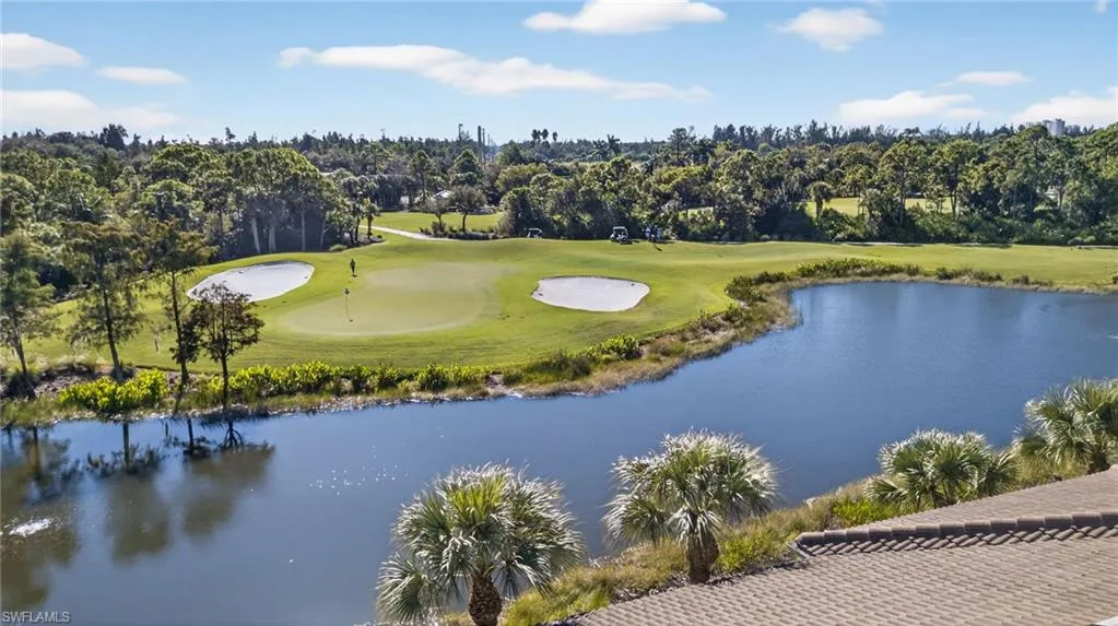 Located in the tranquil, quiet sought after neighborhood of Classic Court. Discover this spacious second-floor carriage home offering stunning southeast exposure with serene golf and lake views. The kitchen is a chef’s delight, featuring honed quartz countertops, GE stainless steel appliances, wood cabinets and a pantry with custom wood shelving. The primary suite boasts lanai access, a walk-in closet with an upgraded closet system, and a luxurious bath with dual sinks and a walk-in shower. Two guest bedrooms and an updated bath featuring new vanity, granite counter-top, decorative mirror and updated fixture. This guest suite has been thoughtfully positioned for privacy, complemented by a versatile den/office space. Enjoy outdoor living on the tiled wraparound lanai overlooking the 5th hole green of the Sound course, complete with 2024 hurricane screens for peace of mind. This home combines elegance, functionality, and breathtaking views—perfect for your Florida lifestyle! A/C and water heater 2024. If you are looking for an active lifestyle look no further: 27 holes of Championship golf, 14 pickleball, 8 tennis and 6 bocce courts. State of the art fitness center that is professionally staffed. Pelican Sound is nestled up to the Estero River with access to the Gulf. The community offers dry boat storage, kayaks, canoes and paddle boarding, along with a shuttle boat to Lovers Key State Beach Park. Minutes from RSW International airport and surrounded by fabulous shopping and restaurants. Start Living The Dream!