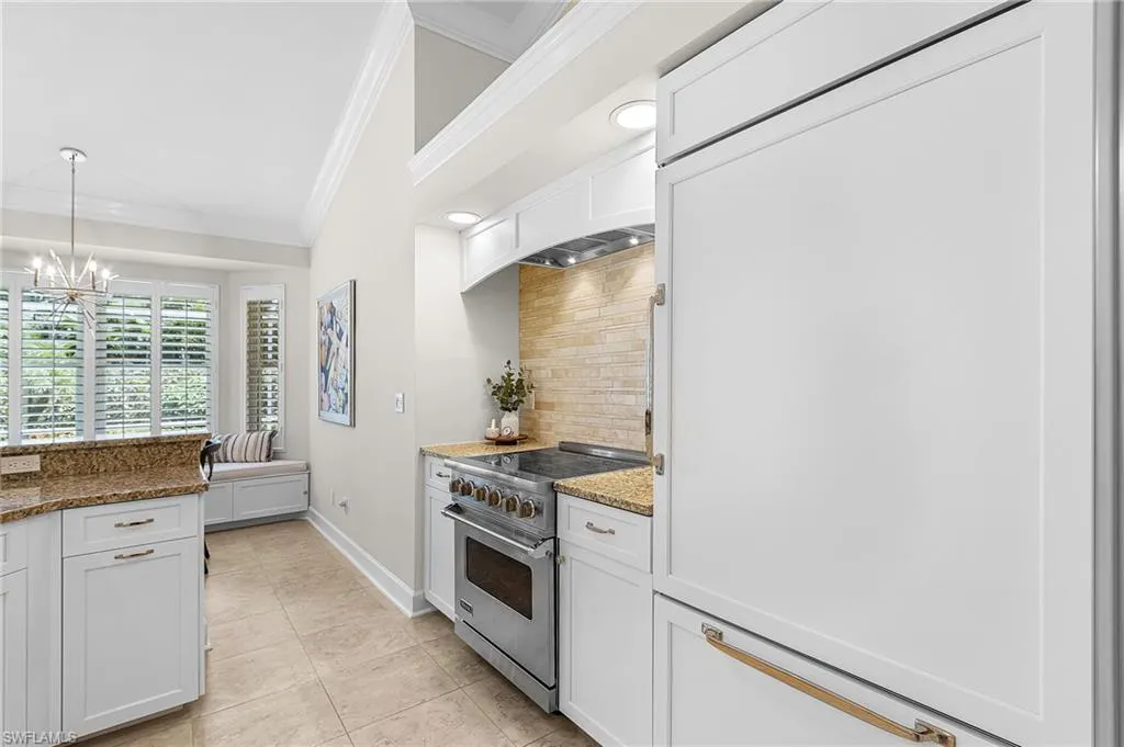 Inside, the upgraded kitchen features custom cabinetry with pull-out shelving and soft-close doors, complemented by a Viking range — perfect for both the casual cook and the culinary enthusiast. The home is further elevated with oversized baseboards, crown molding, and elegant plantation shutters.