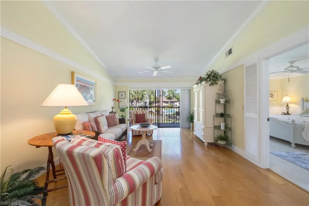 Nantucket meets Naples Beach in this immaculate and tastefully decorated 2 bedroom, 2 bath condo with a 1-car detached garage. This is a quiet, serene community in a great location. Soaring ceilings with lots of natural light and a view from the spacious lanai, with electric shutters, to the “Disney” style pool. A laundry room that has storage galore! Beautiful large kitchen with new LED recessed lights in the ceiling, granite counter, sliders to the front patio, ample cabinets. Tile and wood flood floors, beaded board on the walls and so much more! Offered turnkey furnished.