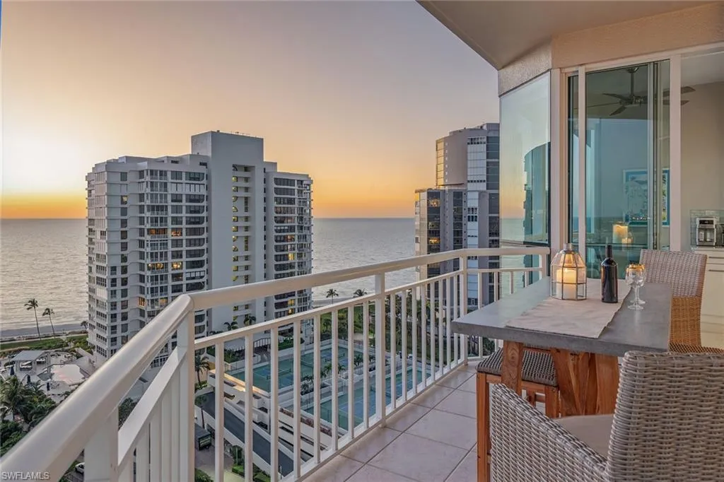 Light and refined, this 15th-floor penthouse residence in Bay Shore Place at Park Shore offers panoramic west-facing views of the beach, Gulf and endless horizon from every room. Designed to emphasize its coastal setting, this unit features ten-foot ceilings, floor-to-ceiling windows, and sliding glass doors that open to three private balconies, each showcasing a dramatic beachfront vista. The two-bedroom, two-bath layout is thoughtfully configured for privacy and comfort. The updated kitchen includes custom cabinetry, quartz countertops, a glass tile backsplash, premium appliances, and a breakfast nook perched above the shoreline. The expansive living and dining areas are finished in a neutral palette, creating a serene and elegant atmosphere. The primary suite enjoys direct beach views from its own balcony and includes a spacious walk-in closet and a beautifully appointed en-suite bath with premium finishes. The guest bedroom, situated separately, offers its own private beach-view balcony and access to a tastefully finished adjacent bath. Additional features include a dedicated in-residence laundry room and ample storage. Bay Shore Place residents enjoy a host of premium amenities, including a private pool, well-appointed fitness center, club room, two guest suites, and direct beach access. The building is moments from the shops and fine dining of Venetian Village and within proximity to Park Shore Marina, where available boat slips and rentals allow for seamless access to the Gulf.