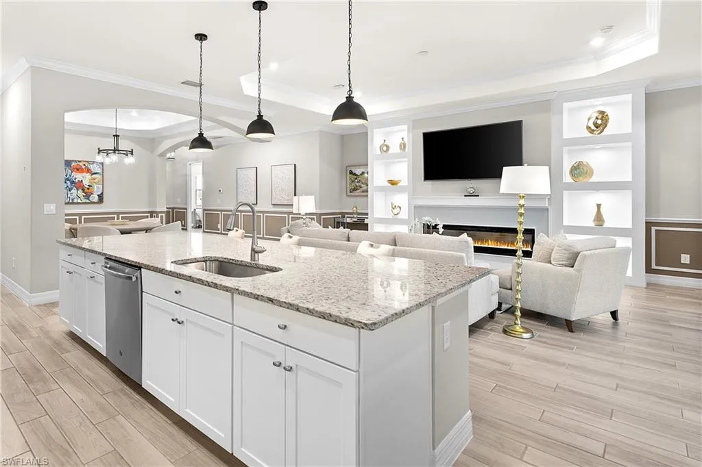 ELEGANTLY DESIGNED “ANGELINA” MODEL WITH SALTWATER POOL/SPA, OUTDOOR KITCHEN & PEACEFUL PRIVATE PRESERVE VIEWS! This magnificent home comes with a SOCIAL MEMBERSHIP and offers 3 bedrooms, 2 Full Baths, 2 Car Garage, 2,062sf living area. The residence is situated on a homesite that provides the best of both worlds… Enjoy LANDSCAPED/WOODED VIEWS FROM THE LANAI and SHIMMERING LAKE VIEWS from the front of the house/guest bedroom. This home was designed with a layout that’s conducive for entertaining. The lanai showcases SEALED pavers, TONGUE-N-GROOVE WOOD CEILING, stone wall & custom OUTDOOR KITCHEN complete with a stainless steel grill, vented hood, refrigerator & storage compartments. Unwind after a long day in the HEATED SALTWATER POOL & SPA while enjoying the private lush landscaping and PRESERVE views. The pool cage is accented by PILLAR LIGHTS and landscape up lighting, perfect to set the evening ambiance. Inside the home, the OPEN CONCEPT living area provides a beautiful entertaining space with a gorgeous FIREPLACE FEATURE WALL complete with built in LED ELECTRIC FIREPLACE and ILLUMINATED SHELVES. The spacious Greatroom/Dining area boasts TRAY CEILINGS, WOOD TRIM ACCENTS and sight lines with NO OBSTRUCTIONS. The kitchen boasts timeless WHITE SHAKER STYLE CABINETRY, granite countertops, a large island, built in stainless steel appliances, desk area & a passthrough window to the outdoor living space. The kitchen cabinetry has DOVETAIL CONSTRUCTION with 42-inch upper cabinets enhanced by a WHITE SUBWAY TILE BACKSPLASH & UNDER-CABINET LIGHTING for an upscale, designer look. Throughout this home, you’ll find sophisticated lighting/ceiling fans, CROWN MOLDING & ALL HARD SURFACES (NO CARPET). The primary suite provides pool & peaceful private views along with direct lanai access. It is outfitted with SHADES, TRAY CEILING & dual walk-in closets with WHITE CLOSET ORGANIZERS. The luxurious bathroom features granite countertops, dual sinks, VANITY area, SOAKING TUB & a WALK-IN SHOWER with HEAVY GLASS. The two guest bedrooms provide guests ample space to stay. Closets are equipped with CUSTOM ORGANIZERS for storage. The Guest Bath is enhanced by a HEAVY GLASS ENCLOSURE. Laundry is complete with cabinetry and sink. The garage comes with epoxy paint floor and CABINETRY for added storage. Have peace of mind during storm season with IMPACT-RESISTANT windows and doors. Bonita National Golf & Country Club is in Flood zone X (no flood insurance required) & centrally located, just a short drive to the Gulf beaches, Airport, upscale shopping, 5th Avenue, Coconut Point Mall, Miromar Outlets, & the exciting upcoming Midtown Bonita! Bonita National offers an impressive array of amenities including an on-site restaurant & bar, resort-style pool, lap pool, spa, upcoming pickleball courts, tennis, fitness center, clubhouse, beauty salon, & 24-hour guard at gate. Social members can play unlimited golf from May-October! *Furniture package available for separate purchase.