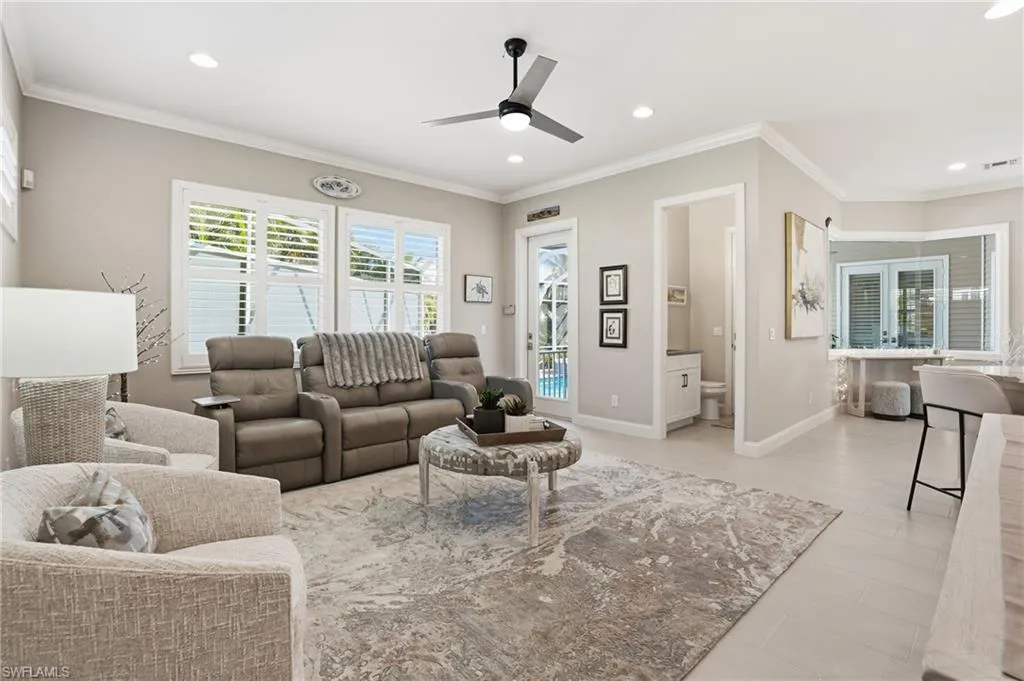 The primary suite serves as a luxurious retreat, featuring calming water views and a spacious walk-in closet. Each bathroom showcases custom-trimmed mirrors and thoughtful finishes throughout. With impact windows and front doors, you’ll enjoy both security and energy efficiency year-round.
