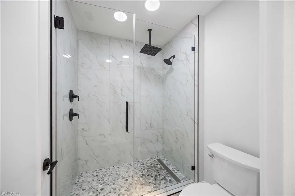 The primary bedroom overlooks the pool and includes slider access to the lanai, a generous walk-in closet, and a beautifully updated bathroom with dual sinks, a soaking tub, and a custom-tiled shower with pebble flooring and glass doors. Two guest bedrooms are connected by a Jack and Jill bathroom with dual sinks and a custom-tiled shower. One guest room includes a built-in desk and shelving. A renovated powder room and a separate laundry room with a new utility sink and additional storage complete the interior space.
