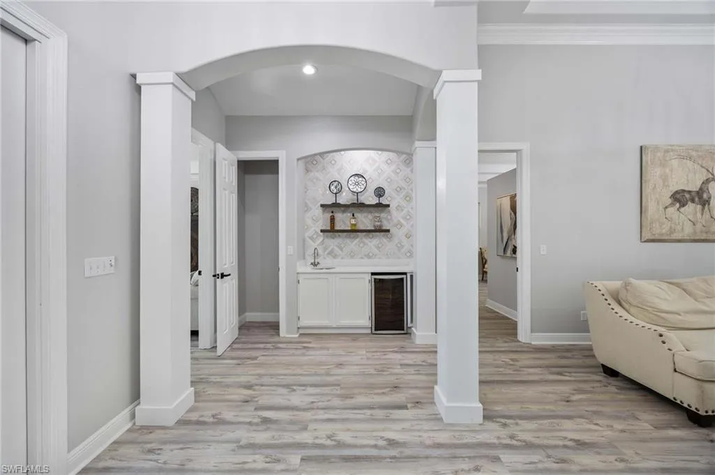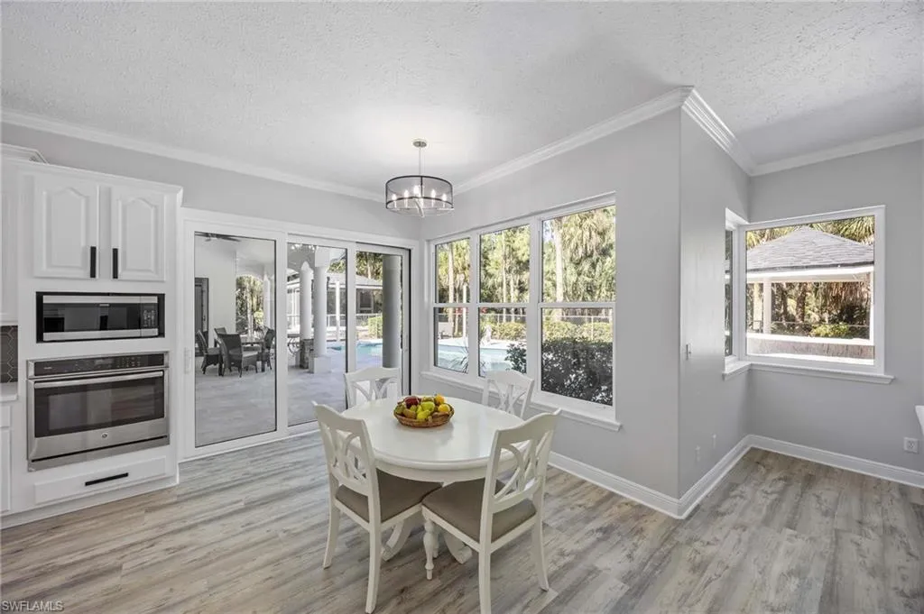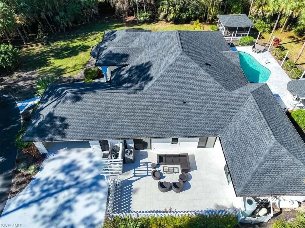 The main home features 3,721 sq. ft. of living area with an open, light-filled layout. Highlights include an expansive chef’s kitchen with waterfall Quartz counters, designer backsplash, premium appliances including a Viking gas range, GE Profile wall oven, and generous cabinetry. A wet bar with wine fridge, formal dining room, large pantry, built-in desk space, and a spacious family room with fireplace create an ideal environment for everyday living and entertaining. The primary suite offers two walk-in closets and direct lanai access. Additional features include updated lighting, plumbing, electrical, luxury vinyl flooring throughout, a large laundry room with sink, and a split floor plan providing privacy for guest bedrooms—each with access to a private side lanai.