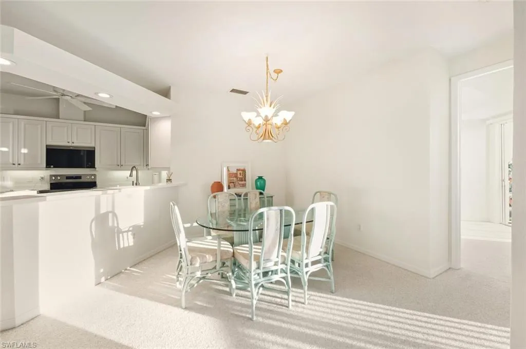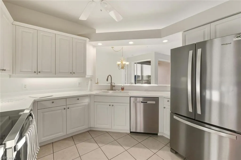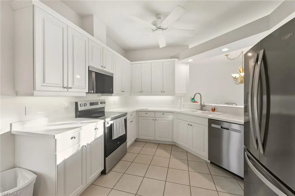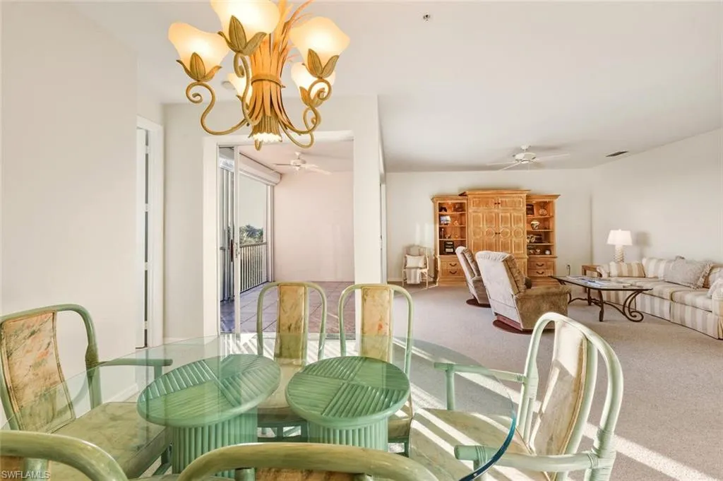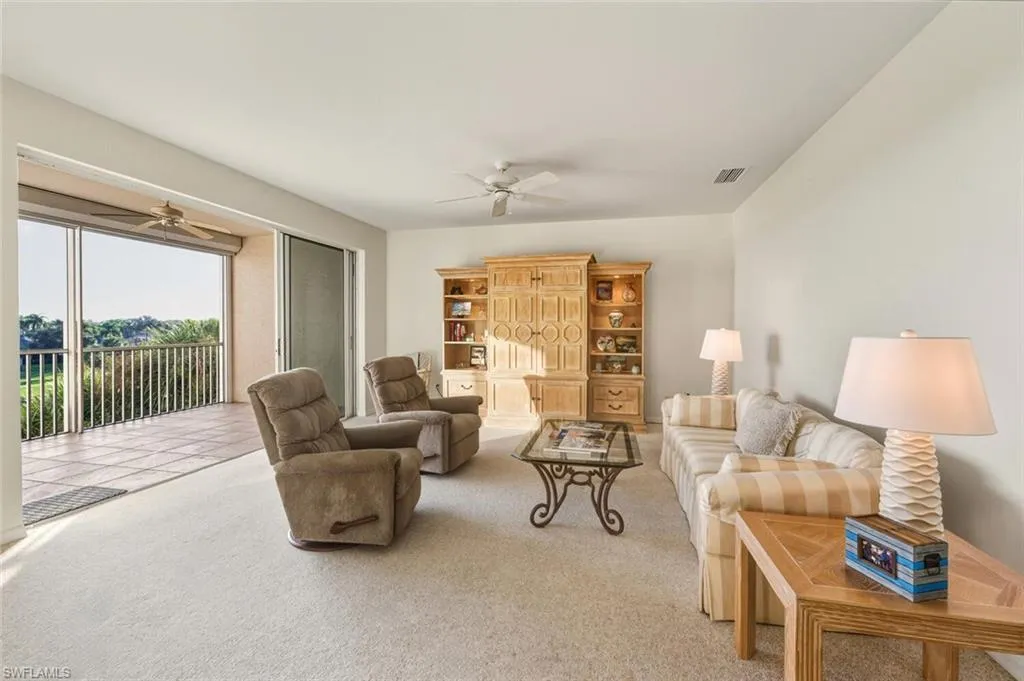 In the center of Pelican Marsh, this elegantly finished 3-bedroom, 2-bath residence offers a refined vantage point with far-reaching southern views across a serene lake and the 9th hole of the Pelican Marsh Golf Course. Inside, the home’s thoughtfully designed layout blends classic style with modern livability, featuring a bright, timeless kitchen with brand-new stainless steel APPLIANCES—including a new refrigerator, new dishwasher, new microwave, and a new glass cooktop stove—along with a brand-new WATER HEATER. The entire residence has been freshly painted and thoughtfully staged, while the primary suite enjoys panoramic views and a refreshed bath with newer fixtures, dual sinks, a soaking tub, and a walk-in shower. The main living and dining areas flow to a private screened lanai showcasing uninterrupted fairway and lake views. Practical features include two prime enclosed parking spaces—one oversized garage under the building with its own garage door, and a second enclosed garage space located directly next to the elevator. Its exceptional location offers quick access to Pelican Marsh’s tennis and pickleball facilities, the popular on-site restaurant Courtside, located right next to the tennis courts, the community fitness center, and it is conveniently located just 3 miles from the beach, as well as close to Mercato’s upscale shopping, dining, and premier entertainment. Property is being sold furnished.