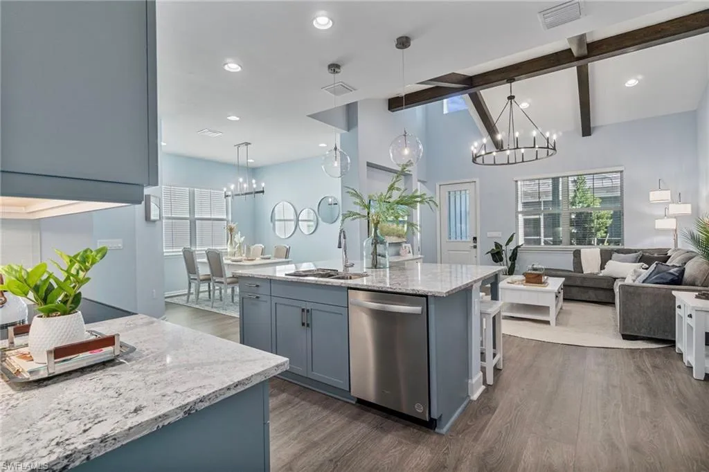 Step into tropical COASTAL ELEGANCE with this attractively FURNISHED “Sanibel Cottage” — an inviting, quiet retreat featuring 2 bedrooms, 2 full upgraded tile baths, and a spacious 2-car garage — all complimented by soft grey blue custom cabinetry throughout. Stylish ash wood look plank flooring flows throughout the main living areas and complemented by the tike: from the warm sand & cream tone stone, modern large format tile and highlights with sparkling mosaic glass tile in both bathrooms. A seamless blend of comfort and tasteful coastal sophistication. The open gourmet kitchen shines with stunning white quartz countertops, nearly never used stainless-steel appliances, high volume ceilings for drama and an open airy layout perfect for entertaining friends and family. WITH FURNISHINGS and curated DECOR CONVEYING – the investment or snowbird value exceeds other options. The result —— an enhanced modern coastal cottage feel that delivers a warm, relaxed, and beautifully polished atmosphere for your perfect piece of SWFL paradise!
