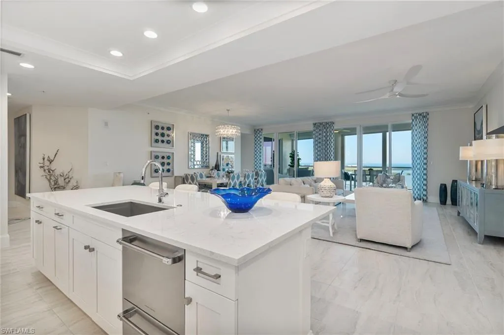 This refined 16th-floor residence in Seaglass at Bonita Bay captures breathtaking, elevated views of the Gulf, Bay, golf course, and lush mangroves—offering an elegant retreat in one of Southwest Florida’s most coveted high-rises. Originally the model residence, this condominium comes turnkey furnished with elegant, designer-selected pieces from the renowned Robb & Stucky. A huge west-facing lanai extends your living space outdoors, enhanced with glass inlays for unobstructed views, electric hurricane shutters, and a built-in gas grill—the perfect setting for morning coffee, sunset cocktails, or simply taking in the ever-changing coastal panorama. Designed for both sophistication and effortless livability, this 3-bedroom plus den, 3.5-bath residence welcomes you with walls of floor-to-ceiling glass sliders and picture windows that bathe the interior in natural light while framing dramatic evening sunsets. The open great room seamlessly flows into the dining area and gourmet kitchen—an inviting setting ideal for relaxed living or stylish entertaining. The chef-inspired kitchen features premium cabinetry, a large island with seating, top-tier appliances, gas range, and stunning backsplash. The spacious primary suite is a serene private sanctuary with Gulf-facing views, a spa-like bathroom with double vanities, an oversized shower, and two generous walk-in closets. Two beautifully appointed guest suites—each offering its own en-suite bath—are connected by a gorgeous east-facing open balcony that captures sweeping views of the Bonita Bay golf course and surrounding community, creating a serene and private retreat for visitors. The versatile den offers an ideal flex space for an office, media room, or additional guest accommodations. Additional features include two designated parking spaces and an additional storage space. Residents of Seaglass enjoy access to world-class amenities including a resort-style pool, state-of-the-art fitness center, rooftop sun deck, guest suites, theater room, massage rooms, and concierge services. Paired with Bonita Bay’s award-winning lifestyle—featuring miles of walking trails, a marina, private beach park, and optional membership to the Bonita Bay Club—this residence offers the ultimate combination of luxury, comfort, and convenience. A sophisticated turnkey residence in the sky—ready to enjoy from day one.