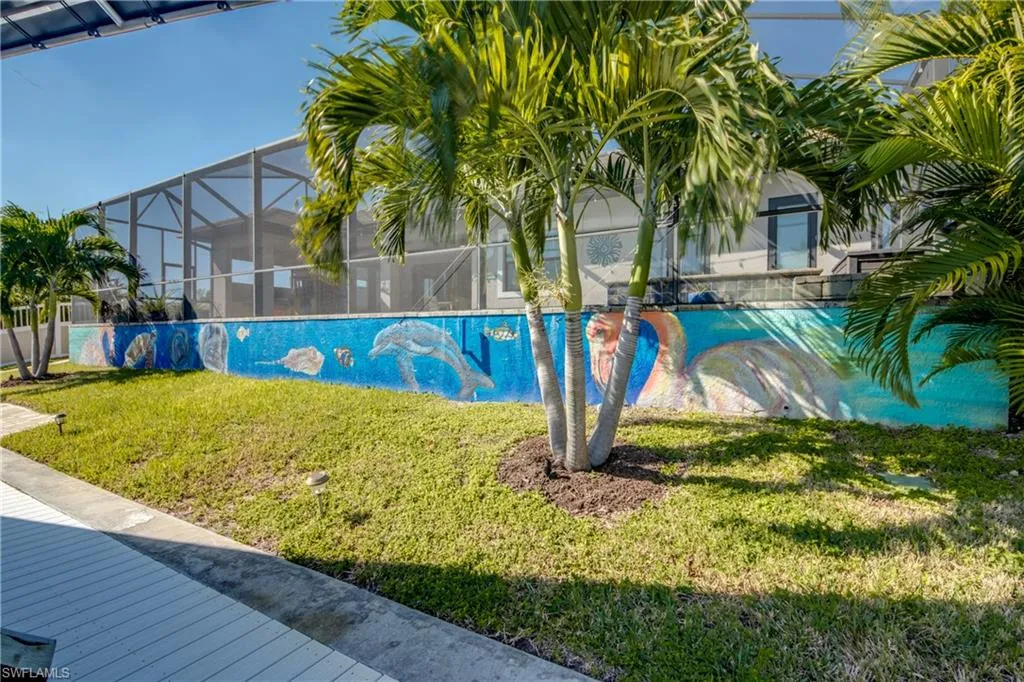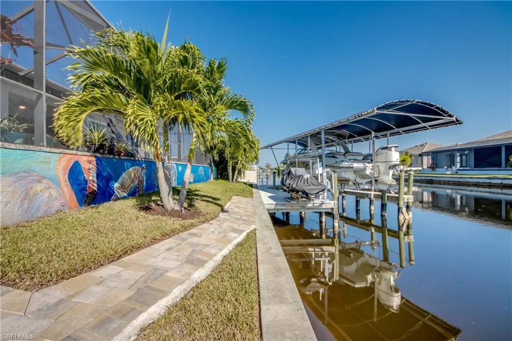 With 3 bedrooms + DEN, 3 baths, and nearly 2,400 sq ft under air, the owner’s suite feels like your own hotel spa—walk-around shower, soaking tub, dual vanities + makeup vanity. Outside, the fun continues: saltwater pool & spa with bubblers, huge lanai, outdoor kitchen, outdoor shower, pool bath, and pre-wired surround sound. The exterior is completely fenced in, and the waterfront lifestyle is topped off with a new composite dock, 10,000lb boat lift, and jet ski lift—and wait until you see the whimsical hand-painted mural on the retaining wall!