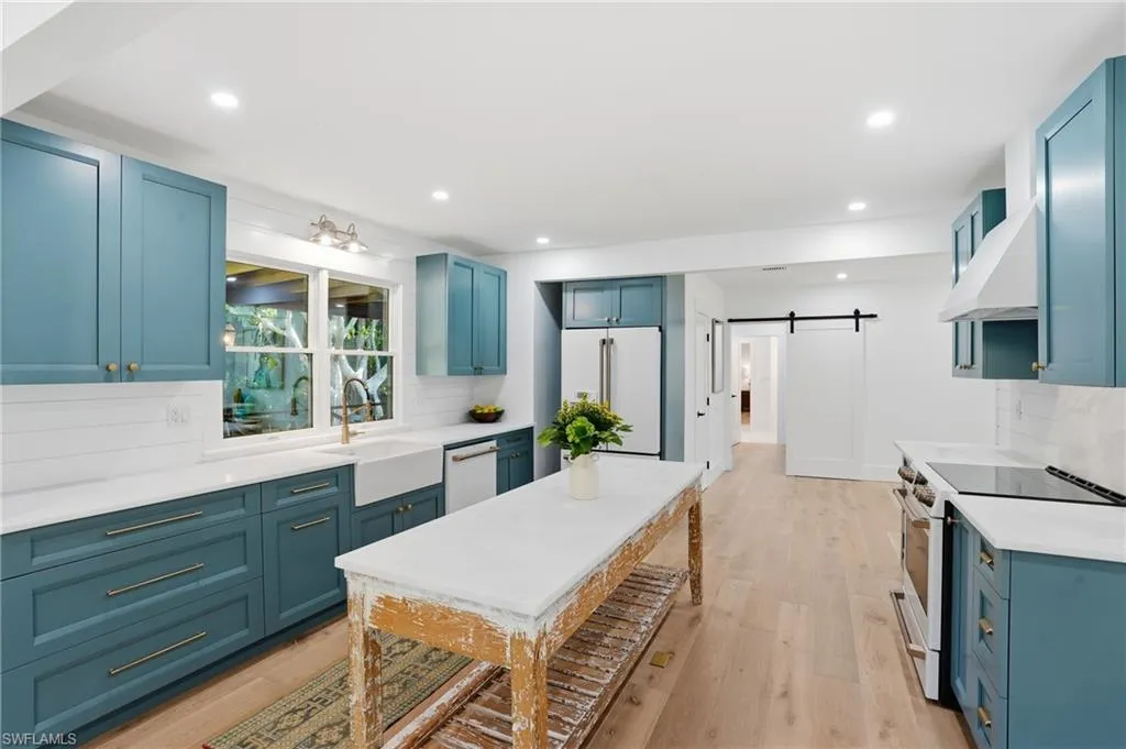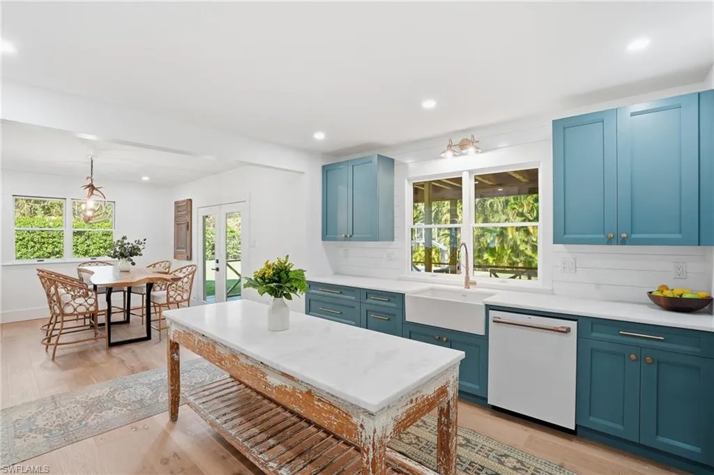 Inside, the open layout is filled with natural light and anchored by a coastal-inspired kitchen with teal shaker cabinetry, brass hardware, white quartz countertops, a farmhouse sink, and a rustic center island. Wide-plank, white oak floors flow throughout the living and dining areas, creating a warm, cohesive feel.