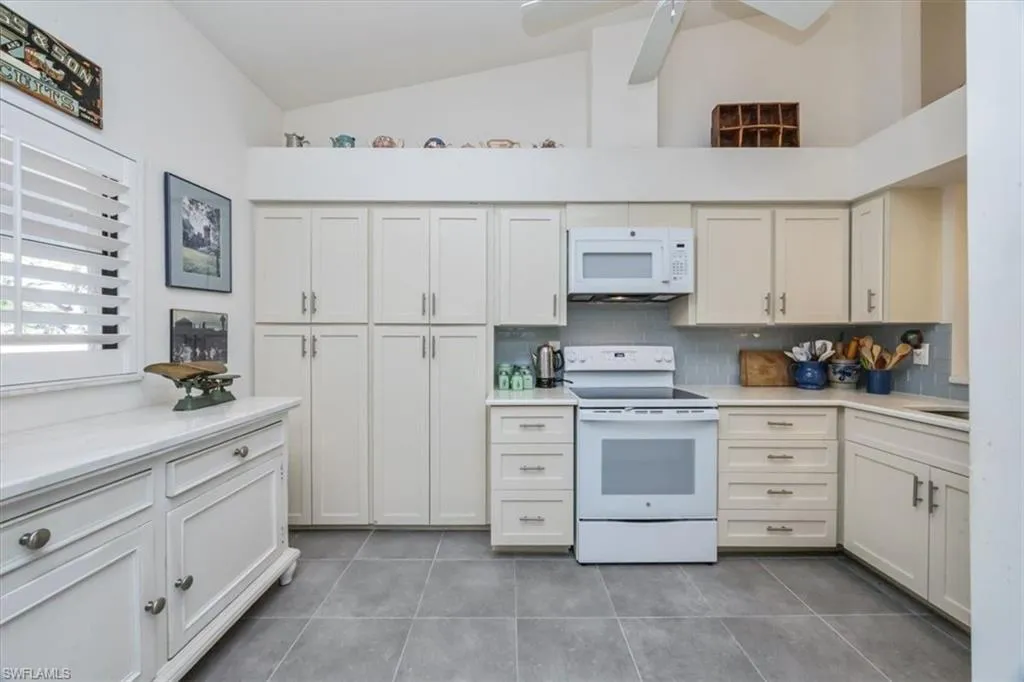 Experience stunning Eastern Lake views the moment you arrive at this beautifully maintained 3-bedroom, 2-bath END UNIT residence. The remodeled kitchen features custom wood cabinetry, soft-close drawers, quartz countertops, and a striking glass backsplash that adds a touch of elegance. The kitchen, foyer, and hall offer easy-care tile flooring, while the bedrooms and living/dining area are comfortably carpeted. Vaulted Ceiling & Plantation shutters add warmth and character throughout. Primary and guest bedroom come complete with a nice walk-in closet with 3rd bed currently being used as a den has a standard closet. Property comes complete with Electric Hurricane shutters on the Lanai and Impact Glass Window in the 3rd bedroom/den ONLY. New Garage Door opener in August 2025.