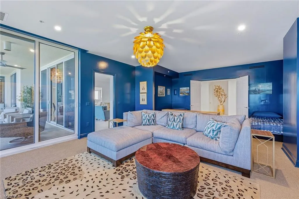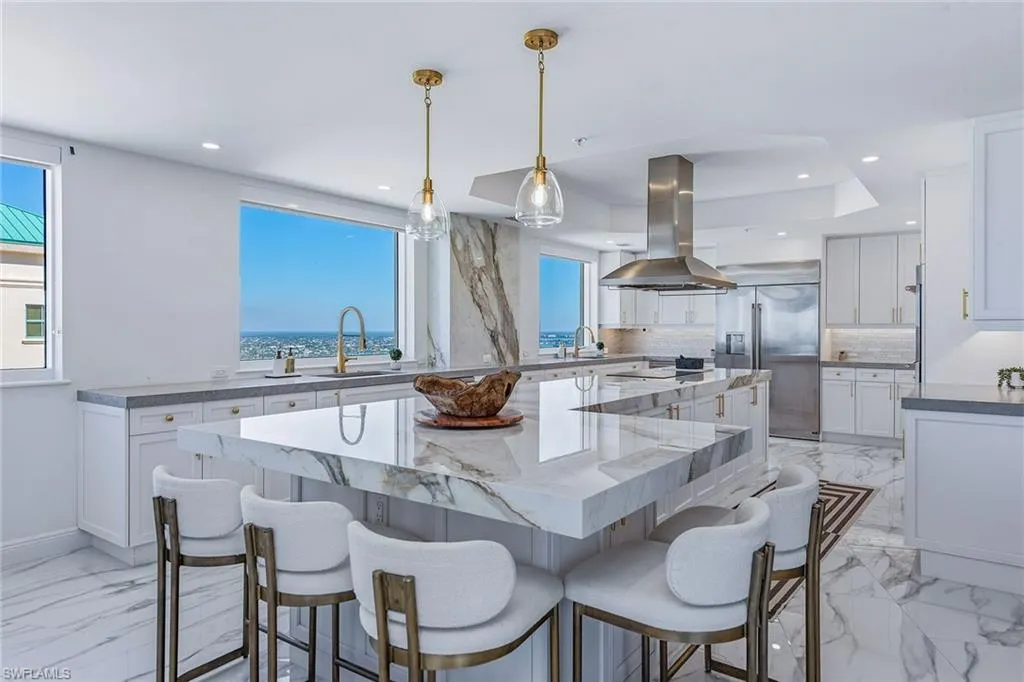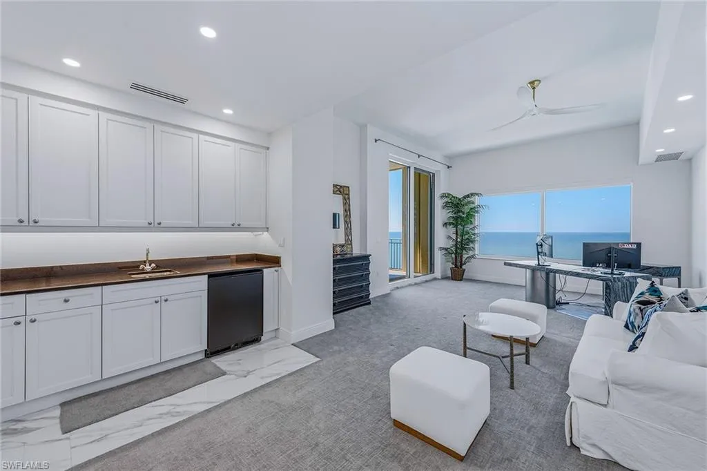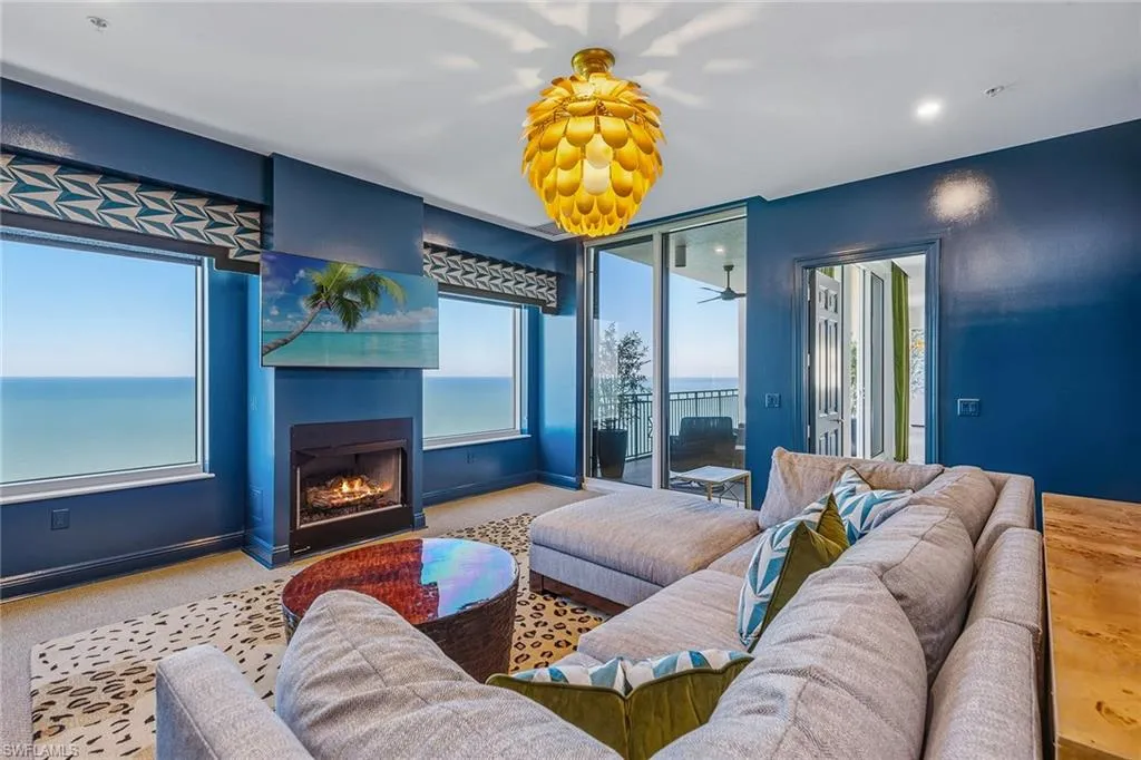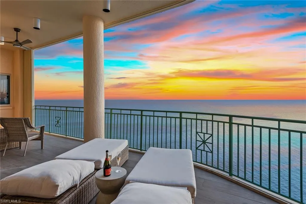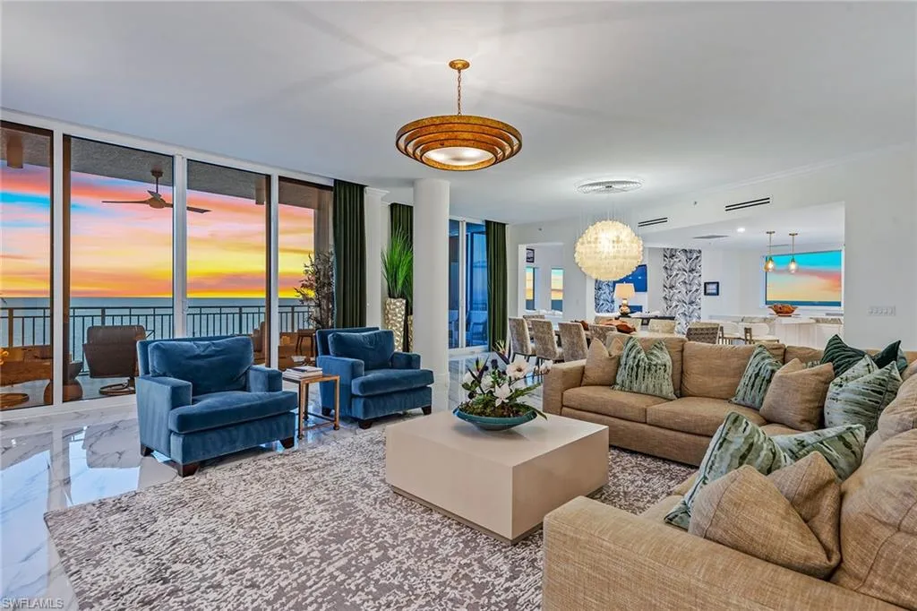 Perched above the shimmering shoreline at the southern tip of Marco Island, this extraordinary Penthouse at Belize in Cape Marco is a rare coastal masterpiece where breathtaking panoramas, magazine-worthy renovation, and ultra-luxury resort living converge in spectacular fashion. From the moment the elevator opens into your private foyer, sweeping Gulf, beach, and island views pour in, setting an unforgettable tone for a residence designed to awe at every turn. Italian porcelain floors flow through a brilliantly reimagined interior that blends warm coastal elegance with sophisticated style, beginning in the welcoming grand salon, where walls of glass frame dolphins at play, boats drifting across turquoise waters and vibrant sunsets painting the sky each evening. The chef’s kitchen impresses with abundant white cabinetry, sunlit counter space, an expansive island, and seamless connection to casual and formal living areas. A newer stainless steel GE double-wall oven enhances the exceptional culinary experience, complementing the home’s refined coastal design. The adjacent Gulf-front den with a fireplace creates an intimate waterside retreat for morning coffee or quiet evenings. A separate media room, also with a fireplace and dramatic picture windows, adds another inspired living space, while the beautifully appointed office with a wet bar, wine cooler, and lanai access balances productivity and relaxation. The primary suite is a sanctuary of serenity, where a full wall of glass opens to endless horizon views, complemented by dual walk-in closets including a cedar-lined closet, a private sauna, and a spa-caliber bath with soaking tub, frameless glass shower, dual water closets and a bidet. Equally impressive guest accommodations include a grand en-suite bedroom with its own open-air lanai overlooking the entire island, a two-room suite with sitting room and wine cooler, and a visionary bunk room with eight full-size beds, ideal for gatherings that create lifelong memories. Thoughtful details continue with a spacious laundry room and direct access to the discreet service corridor connecting to the trash chute, utilities, service elevator and stairs. Offered fully furnished, you have the opportunity to enjoy your new penthouse immediately. Outside, the premier amenities offered to Belize residents elevate the lifestyle even further-swim in the waterside pool, unwind in the hot tub, grill in the covered outdoor kitchen, work out in the Gulf-front fitness center, watch movies in the theatre or play billiards, or play tennis and pickleball at Cape Marco before strolling to Marco Island’s famed crescent beach via the private direct beach access. Guest suites and EV charging also available. Two prime garage spaces near the elevator and convenient bike storage complete this remarkable offering. Steps from dining and boutiques, this penthouse delivers a refined coastal lifestyle with remarkable value.