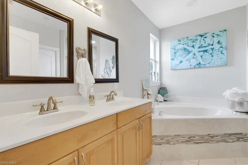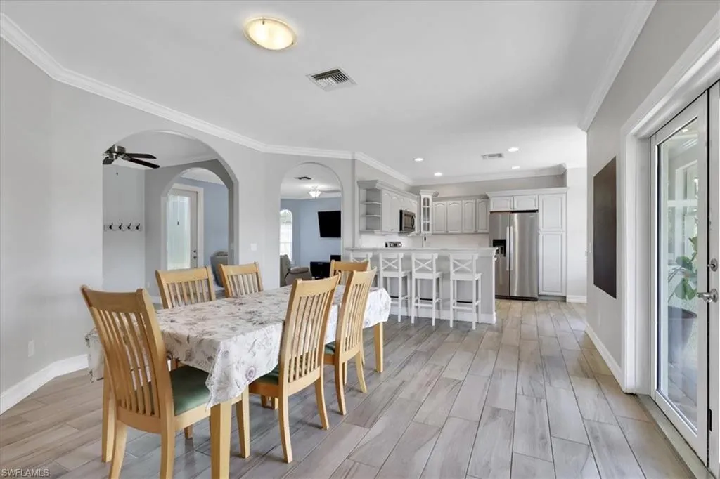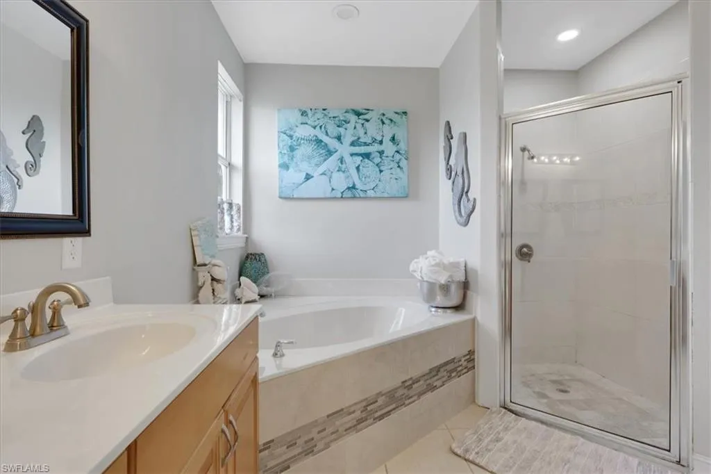 Inside, the home features plank tile flooring throughout, crown molding, stainless steel kitchen appliances, beautiful cabinetry, and a whole-house reverse osmosis system. The dedicated laundry room is conveniently located inside the home. The spacious primary suite includes a walk-in closet, dual sinks, and a separate tub and shower.