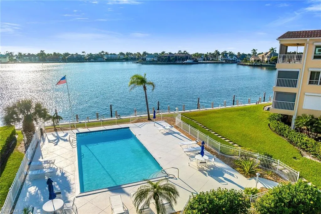 Enjoy sweeping views of Smokehouse Bay, stunning sunsets and effortless coastal style in this beautifully furnished second-floor residence in the heart of Marco Island. Offering direct Gulf-access boat docks, a screened balcony accessible from the living room and primary bedroom, and tranquil bay and pool views, this light-filled retreat captures the best of island living. The home blends comfort, convenience and an enviable location close to everything Marco Island is known for, creating a serene sanctuary to unwind after a day on the water or at the beach. The spacious two-bedroom, two-bath floor plan features crown molding throughout, tile flooring in every room, and ceiling fans that enhance comfort year-round. The living room opens through glass sliders to the screened balcony, where gentle breezes and waterfront scenery set the tone for relaxation. The kitchen is well-appointed with a tray ceiling, stainless steel appliances, a pantry and recessed lighting, creating a bright, functional space for everyday living and easy entertaining. Whether you’re preparing a casual breakfast or hosting friends, the layout is designed for comfort and style. The primary bedroom offers a private retreat with double French door entry and direct access to the screened balcony. Its en-suite bath features floor-to-ceiling mirrors, quartz countertops, white shaker-style cabinetry, a double vanity with makeup counter and full-width mirror, and a walk-in shower with a glass enclosure and floor-to-ceiling tile. The guest bedroom is equally inviting and paired with a nearby guest bath featuring quartz countertops, a shower-tub combo with a glass slider. Additional conveniences include an in-unit washer and dryer, as well as electric and manual storm shutters. Residents enjoy a wealth of amenities, including a community pool, all within a quiet, well-maintained waterfront setting. Minutes from pristine beaches, upscale boutiques, fine dining, parks, museums, golf courses and endless outdoor recreation, from kayaking and paddleboarding to tennis, pickleball and biking, this home combines coastal luxury with the vibrant lifestyle Marco Island is celebrated for, with the nearby executive airport ensuring effortless travel.
