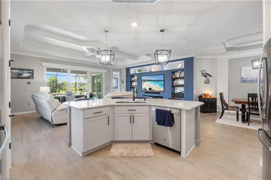 From the moment you step through the custom glass front door, the warmth and thoughtful design of the home unfold before you. The foyer leads directly to a stunning screened-in pool area featuring a tongue-and-groove ceiling, an inviting hot tub, and a full outdoor kitchen equipped with an upgraded grill, hood, TV, refrigerator and gas fireplace. Entertaining here is effortless, enhanced by an electric hurricane storm screen for peaceful enjoyment year-round.