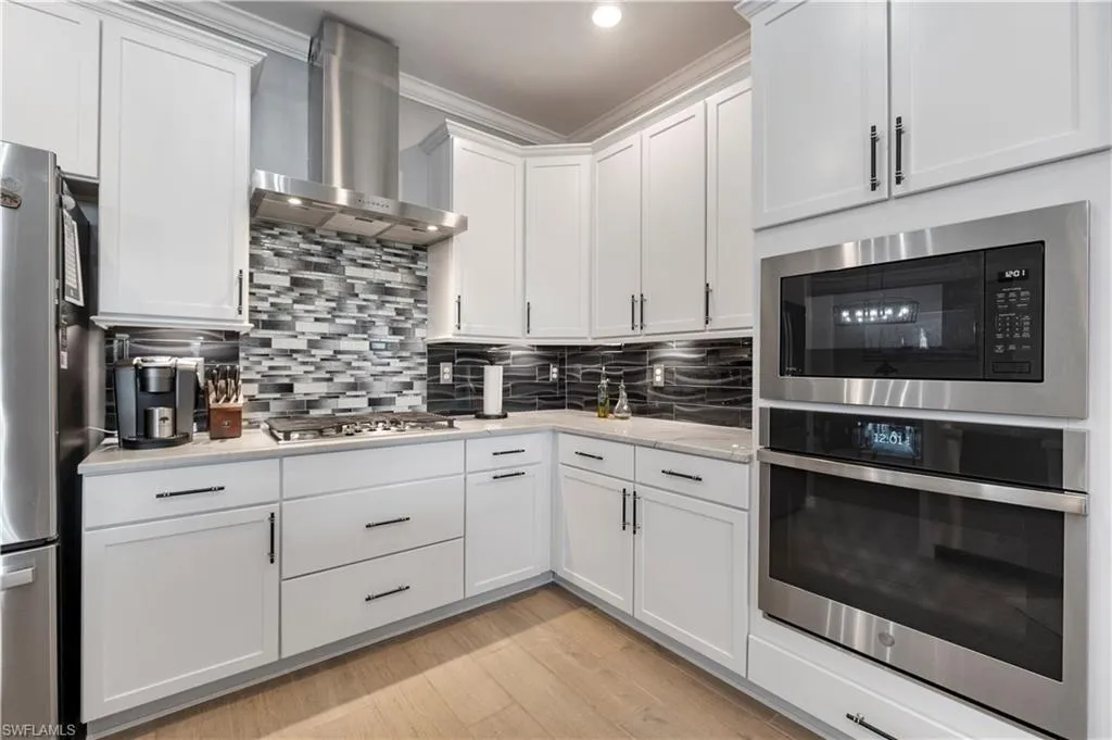 The living space reflects sophistication with a coffered ceiling, recessed lighting, and an entertainment wall complete with shelving and an electric fireplace. A cozy bar setup invites gathering & relaxation. Throughout the home, custom paint, tile floors, crown molding, quartzite kitchen countertops w/a custom backsplash, & upgraded appliances elevate the daily living experience. The master suite is designed as a tranquil retreat, boasting dual custom walk-in closets, a sitting area, and a luxurious bathroom featuring dual vanities, a tub, and a shower.
