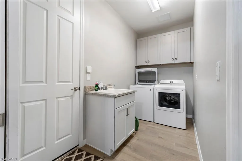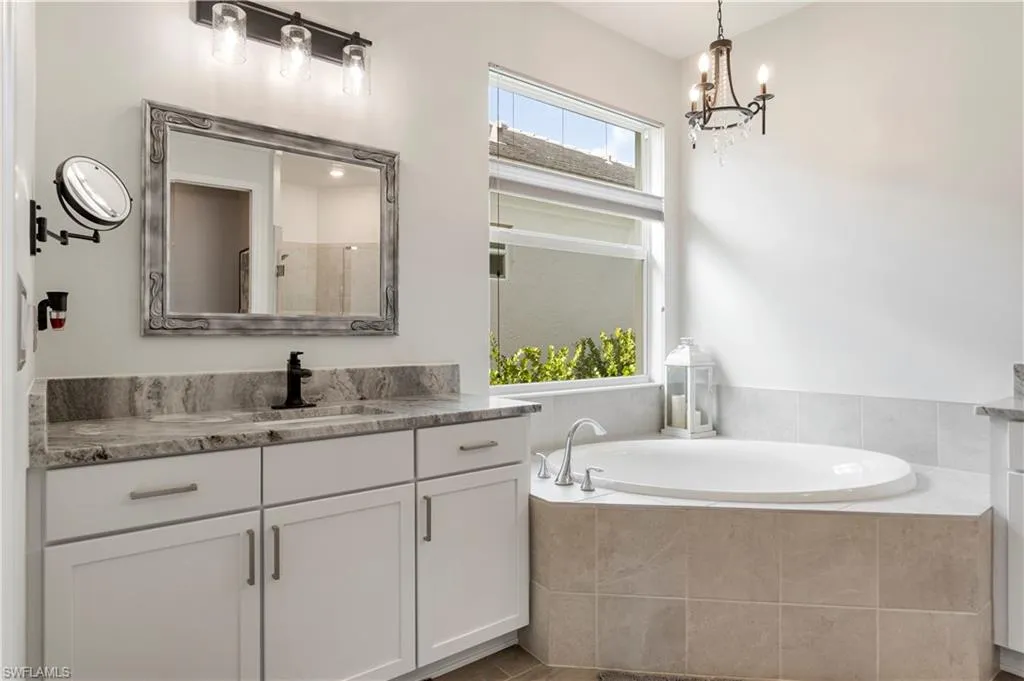 Additional upgrades include remote-controlled shades in the master and living areas, custom closets in the den, and granite countertops in the bathrooms. The practical yet elegant laundry room is fitted with cabinets and a sink, while exterior improvements such as added gutters, a widened driveway, a Ring alarm system, and a whole-house Culligan water treatment system enhance convenience and security.