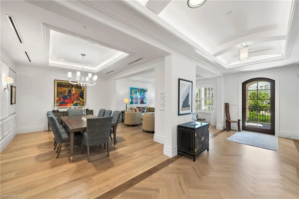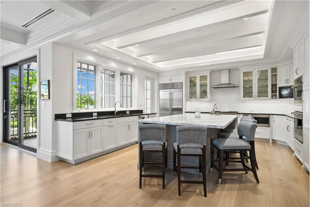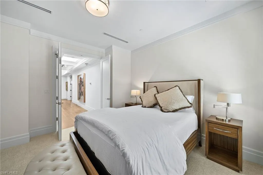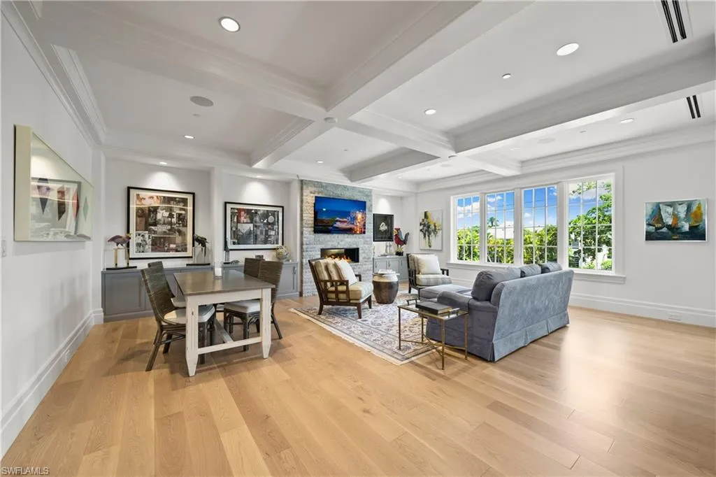 Steps from the boutique shopping and dining of Crayton Cove and offering nearly 5,000 square feet of living space, this 2019-built townhouse is an exceptional option for both part-time and full-time Naples living. Blending the scale of a single-family home with the lock-and-leave convenience of a condominium, Le Petite Trianon features an attached two-car garage, private elevator, refined finishes, and two levels of light-filled living framed by impact glass. The main living level showcases a stunning chef’s kitchen with an oversized center island, double wall ovens, and gas range, all opening seamlessly to the spacious family room with stacked-stone fireplace and an inviting open-air balcony. The upper level is home to the impressive primary suite, designed for ultimate privacy with dual baths, separate vanities, a soaking tub, walk-through shower, and a generous closet—ideal for those who appreciate their own space. This level also includes a convenient laundry room and two ensuite guest bedrooms, each with access to an open-air balcony. Cap off each day on the private rooftop terrace, where panoramic views of Naples and Naples Bay create a truly unforgettable backdrop. Unique in its design and unmatched in lifestyle, this residence is the perfect finishing touch to the quintessential Naples retreat.