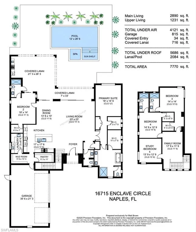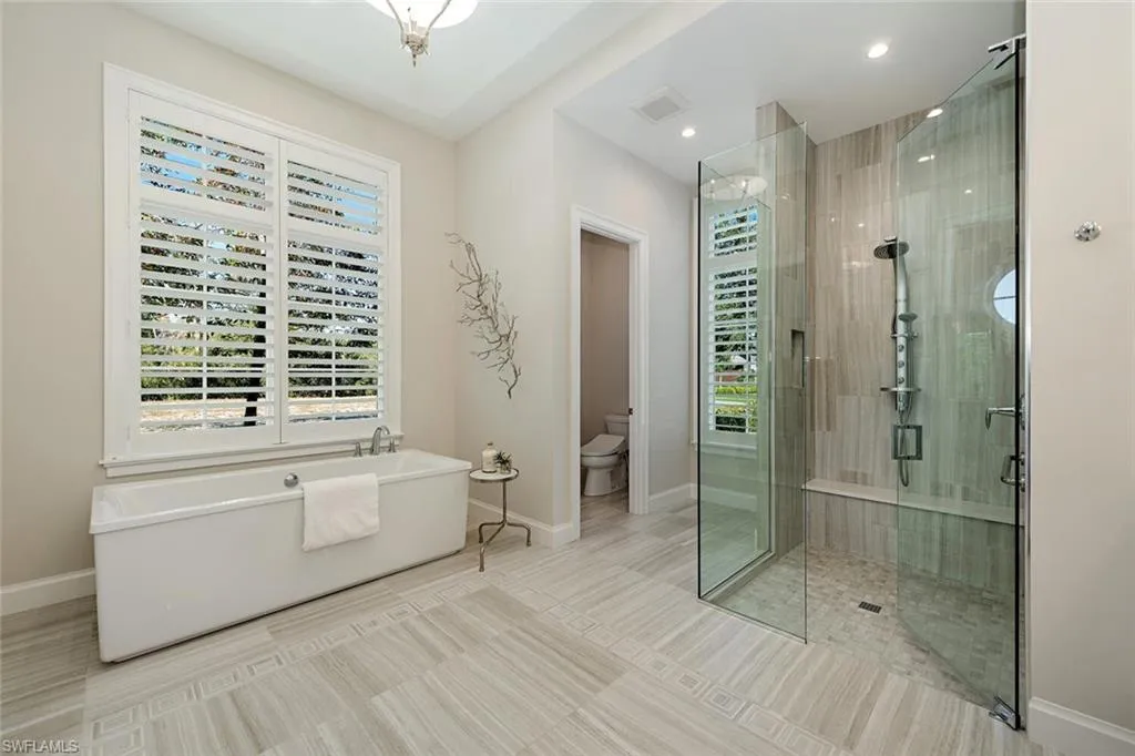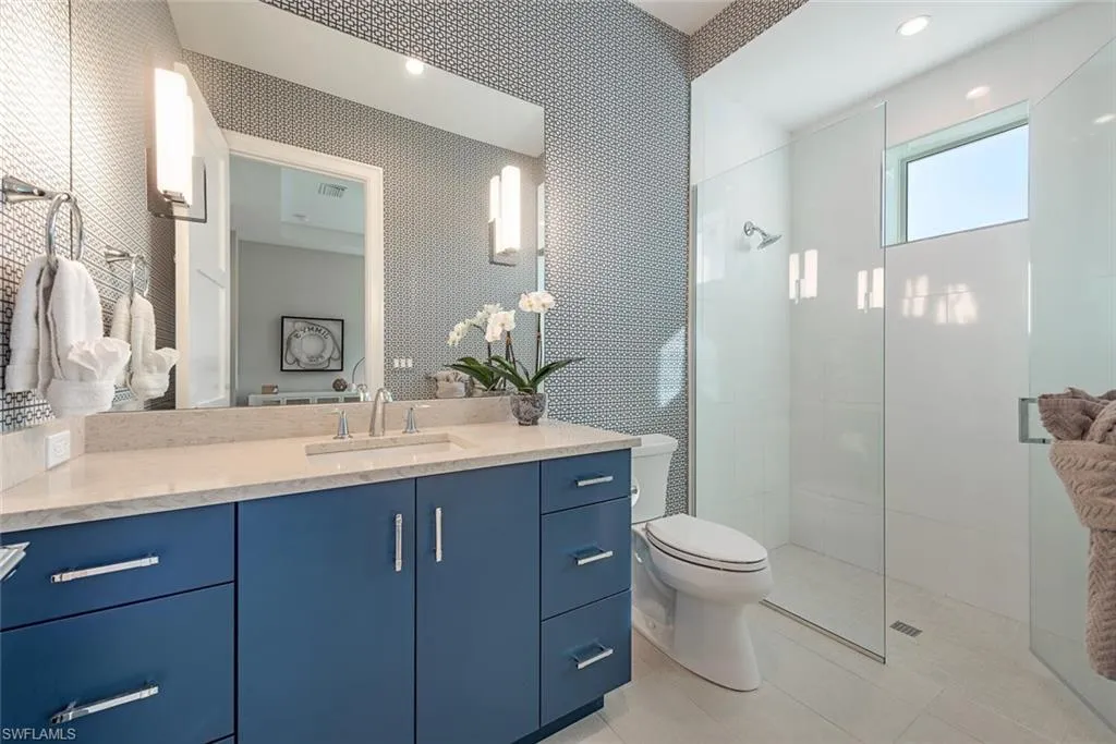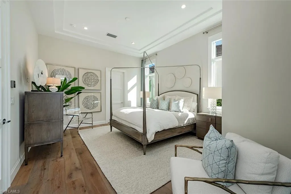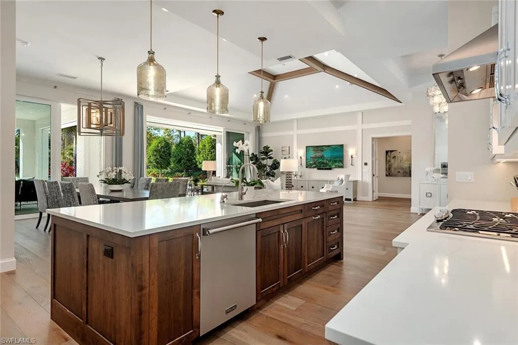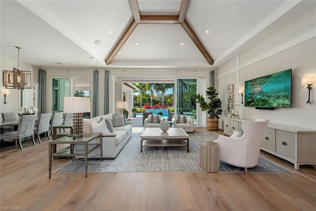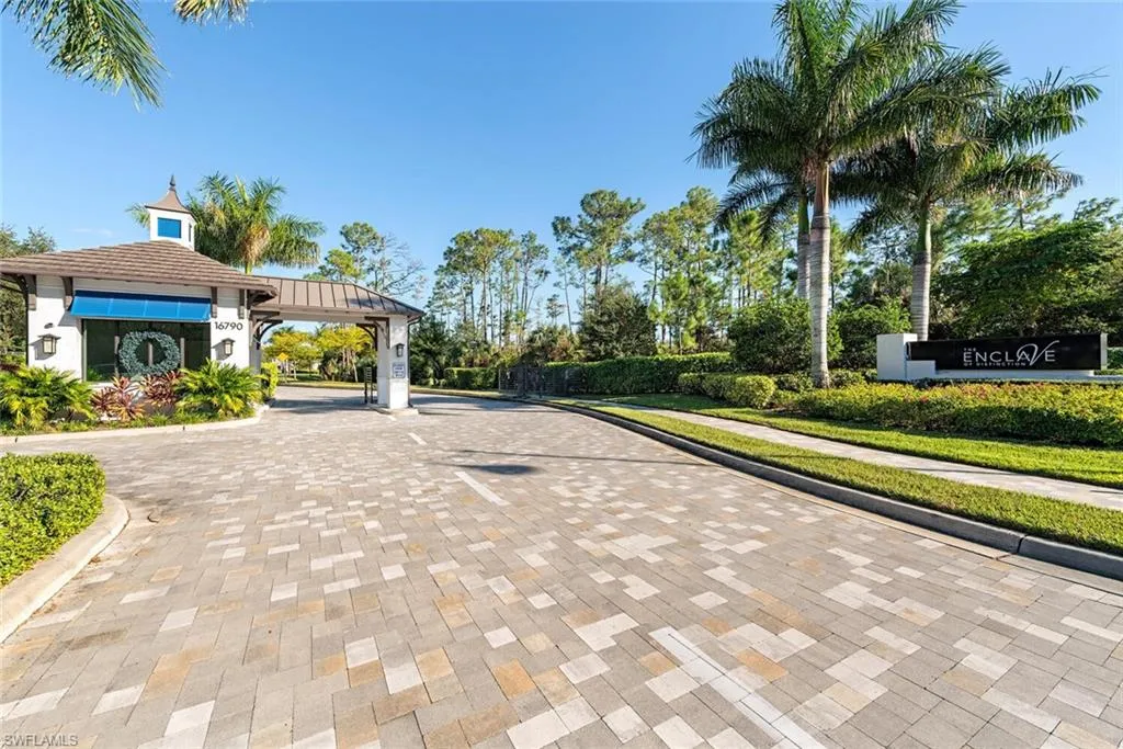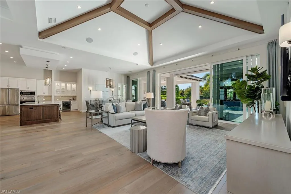 Stunning showcase home in The Enclave of Distinction, designed by renowned Naples firm Stofft Cooney Architects and brilliantly finished by Molly Hoover Interior Design. Set within a boutique gated community of just 27 residences, known for its paver streets, lush landscaping, sidewalks, and warm sense of privacy, this former model home offers 4,121 square feet of beautifully curated living space. The residence features 4 en-suite bedrooms, a den, a powder room, mud room, a second-floor family room, and a 3-car air-conditioned garage. Upon entering, a 15’ lofted ceiling with custom beam millwork, wide-plank white oak floors, and a full wall of sliding glass doors create a stunning welcome that flows seamlessly into the home’s outdoor oasis. The expansive 716-square-foot outdoor living area, complete with motorized bug screens and an outdoor kitchen, overlooks a custom-designed pool with sun shelf, sunken spa, and waterfall feature, all framed by updated tropical landscaping. Western exposure provides beautiful afternoon light and spectacular sunsets. The open chef’s kitchen includes Viking appliances with gas cooktop, custom wood cabinetry, wine cooler and a large walk-in pantry. The first-floor primary suite offers a luxurious retreat including a spacious bedroom with 12-foot ceilings and paneled feature wall, a spa-like 5-fixture primary bath with a freestanding soaking tub and three closets including two walk-ins with custom closets built-ins. Additional highlights include, designer lighting, custom trim details, draperies, impact glass throughout, a 24kW whole-home generator, a whole home water softener, reverse osmosis filter system in the kitchen. Home is located in the low risk X-500 flood zone where lenders do not require flood insurance. Technology upgrades include smart home automation with Alexa voice control for Sonos audio and Lutron lighting, two HVAC systems with dampers providing four zones of cooling, motorized shades, WiFi-enabled pool equipment and garage door control and a Vitax home security system. Recent outdoor enhancements include all new shellstone patio pavers that were also expanded around the pool, a pool handrail, an updated outdoor kitchen backsplash, improved landscaping and new landscape lighting. — The Enclave of Distinction offers a refined Naples lifestyle with gated security, walkable sidewalks, and proximity to premier destinations including Seed to Table, Gulf beaches, Mercato, and Southwest Florida International Airport. Built by Distinctive Communities, the neighborhood is celebrated for exceptional craftsmanship, natural gas availability, and intimate community design. The community also features two lakes with lighted fountains and a charming gazebo overlooking the water, offering serene gathering spaces for residents. Perfectly positioned between Mediterra and Talis Park, this enclave benefits from impressive architectural consistency and a tranquil setting paired with low HOA fees.