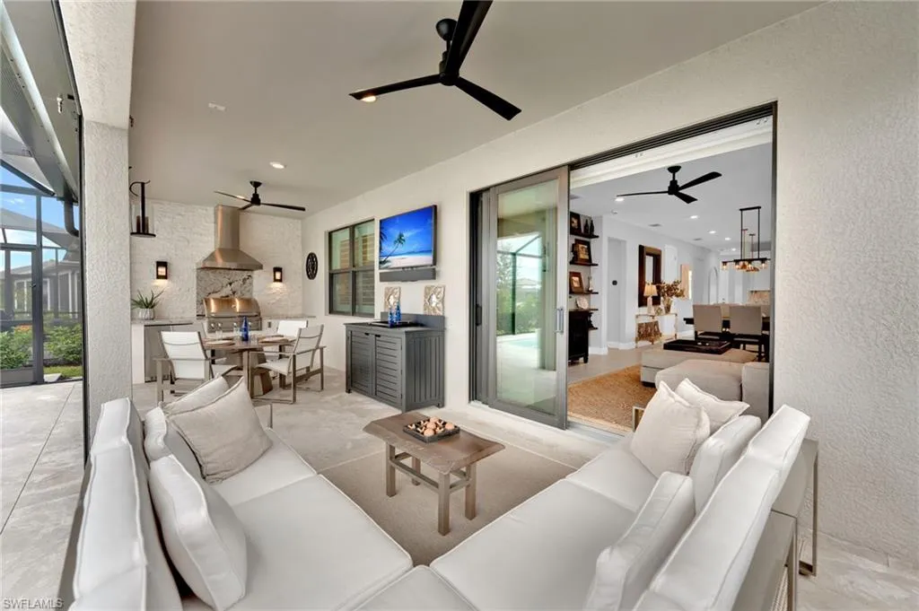 SOUTHERN LAKE VIEWS, CUSTOM SALTWATER POOL & SPA, WHOLE HOME NATURAL GAS GENERAC GENERATOR, HURRICANE-IMPACT WINDOWS & DOORS, ELECTRIC STORM SMART HURRICANE SHADES — this home is fully loaded with HIGH-END UPGRADES! Featuring TWO BEDROOMS + DEN, TWO FULL BATHROOMS, and 1,405 SQFT OF LIVING SPACE, this Pulte-built Contour in Verdana Village combines luxury, low-maintenance living, and Southwest Florida lifestyle at its finest. Many upgrades throughout include TILE FLOORING in main areas and den, RECESSED LIGHTING WITH DIMMERS, PREMIUM 5-INCH BASEBOARDS, PLANTATION SHUTTERS, and CUSTOM VALANCES. The kitchen features WHIRLPOOL STAINLESS-STEEL APPLIANCES, BRAND NEW KITCHENAID DISHWASHER, EXTERNALLY VENTED RANGE HOOD, TILE BACKSPLASH, SOFT-CLOSE CABINETRY with PULL-OUT SHELVING, CUSTOM PANTRY SHELVING, NATURAL GAS APPLIANCES, WATER SOFTENER, and REVERSE OSMOSIS SYSTEM. The primary suite features TRAY CEILING, SOFT CARPET, LANAI VIEWS, RECESSED LIGHTING, FRAMED GLASS SHOWER WITH BENCH, TILE TO CEILING, RAIN SHOWER HEAD, DUAL VANITIES, and CUSTOM WALK-IN CLOSET. The guest bedroom and bathroom offer FRAMED GLASS SHOWER, TILE TO CEILING, and COMFORT-HEIGHT VANITY. A dedicated laundry room and TWO-CAR ATTACHED GARAGE provide added convenience. Step outside to your private resort-style PANORAMIC FRAMLESS SCREEN ENCLOSED lanai features a CUSTOM SALTWATER POOL & SPA with LEATHERED MARBLE PAVERS, PREMIUM DIAMOND BRIGHT PLASTER MIXED WITH QUARTZ, OVERSIZED SUN SHELF, TWO BUBBLERS, HIDDEN DRAINS & SKIMMER, and GAS HEATER. The dream OUTDOOR KITCHEN with GRANITE COUNTERTOP & BACKSPLASH, GRILL with ROTISSERIE & GRIDDLE, HOOD VENT, BEVERAGE COOLER, and DINING/LOUNGE SPACE makes entertaining effortless. Located in the brand new Verdana Village and offers INDOOR & OUTDOOR PICKLEBALL, TENNIS, BASKETBALL, THREE RESORT-STYLE POOLS, DOG PARK, STATE-OF-THE-ART FITNESS CENTER, YOGA STUDIO, and MULTIPLE ON-SITE DINING OPTIONS. The community is just steps from THE SHOPPES AT VERDANA VILLAGE with Publix, restaurants, salons, and more. Conveniently located 15 MINUTES TO SOUTH FLORIDA REGIONAL AIRPORT, 10 MINUTES TO MIROMAR OUTLETS AND GULF COAST TOWN CENTER, 5 MINUTES TO OLD CORKSCREW GOLF COURSE, AND 45 MINUTES TO BONITA AND FORT MYERS BEACHES, this home provides everything for a low-maintenance, stress-free, resort-style lifestyle. Move in and start enjoying the best of Southwest Florida living — a rare opportunity in one of the most sought-after communities.