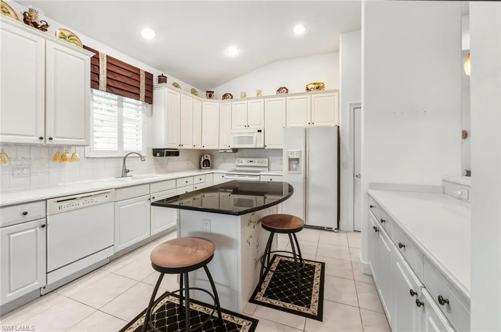 The bright, sunlit living room opens to a covered lanai where you can enjoy long golf-course views of the 18th tee box, fairway, and beautiful sunsets. The open kitchen includes an island, breakfast bar, and ample counter space—perfect for entertaining. A large den provides an ideal space for a home office or flex room.