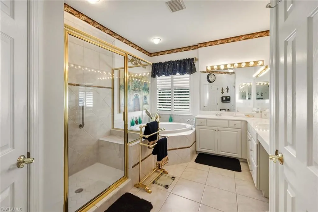 The spacious primary suite offers multiple windows capturing natural light and serene views, along with a luxurious master bath featuring dual vanities, a soaking tub, and separate shower. Two additional guest bedrooms and bathrooms offer privacy and comfort for family and visitors.