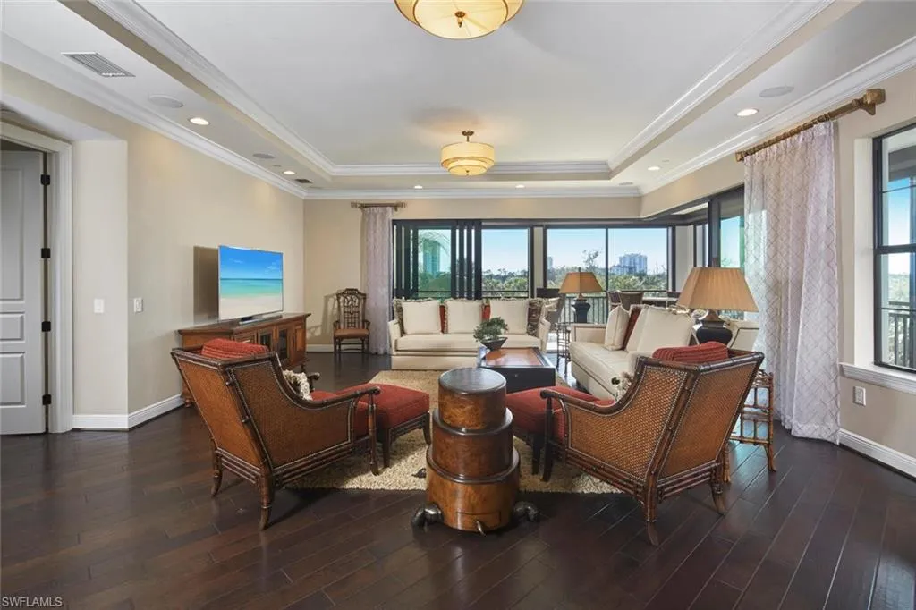 Prepare to be captivated by this exquisite south-facing residence! Private elevator entry leading to an impressive 2900+ square foot open floor plan, this coastal home features 3 bedrooms plus a den and 3.5 baths, ten foot ceilings, rich wood floors….all offered beautifully furnished for your convenience. The award-winning Cielo layout showcases expansive views from the wrap-around lanai, where you can bask in the breathtaking sights of the Colony’s lush emerald-green fairway and preserve land. Negative edge sliders seamlessly merge both interior and exterior lanai space for entertainment and enjoyment…it’s like a single family home. The heart of the home is a magnificent kitchen, complete with a gas cooktop and adorned in a soft, neutral color palette, perfect for entertaining. Built to the highest hurricane storm code, this residence ensures peace of mind alongside comfort and style.The Colony presents the best possible lifestyle with dining membership to The Bay Club, private beach park, a huge tennis, canoeing/kayaking, sailing club, bocce, and the latest sensation…pickle ball! Located within minutes of shopping, restaurants, sports arenas, performing art centers, world-renowned beaches, and SWFL international airport.