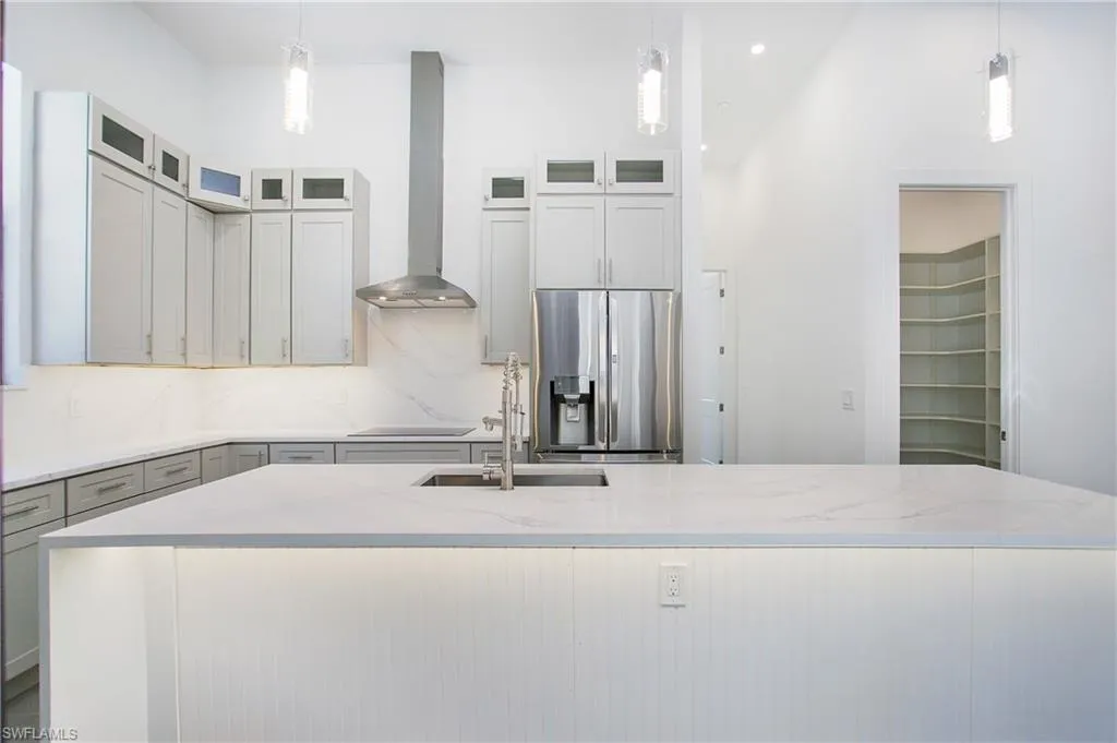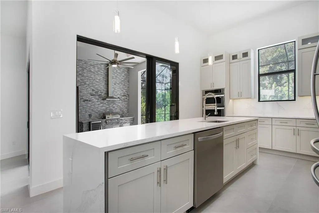 New 2024 construction includes: metal roof, impact windows/doors, central electric HVAC, central irrigation system, custom interior cabinetry, outdoor kitchen, wine cooler, built-in mirrors, French doors, laundry tub, volume ceilings, and premium tile flooring throughout. Equipped with washer/dryer hookup, electric heated pool/spa, and upgraded appliance package including wall oven, microwave, refrigerator/ice maker, dishwasher, disposal, and electric cooktop.