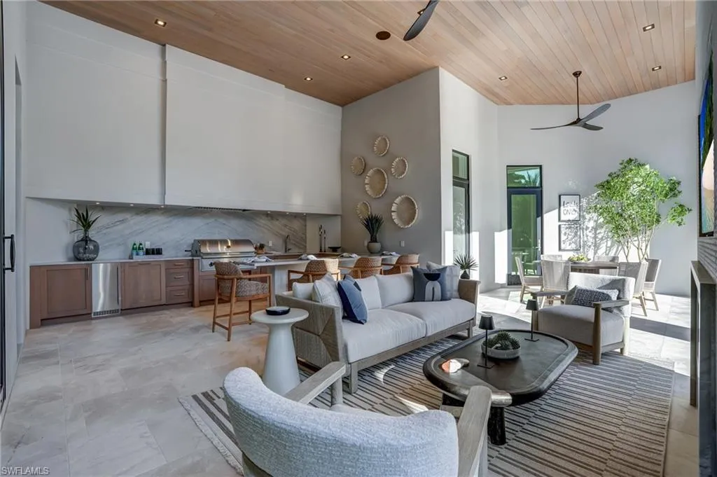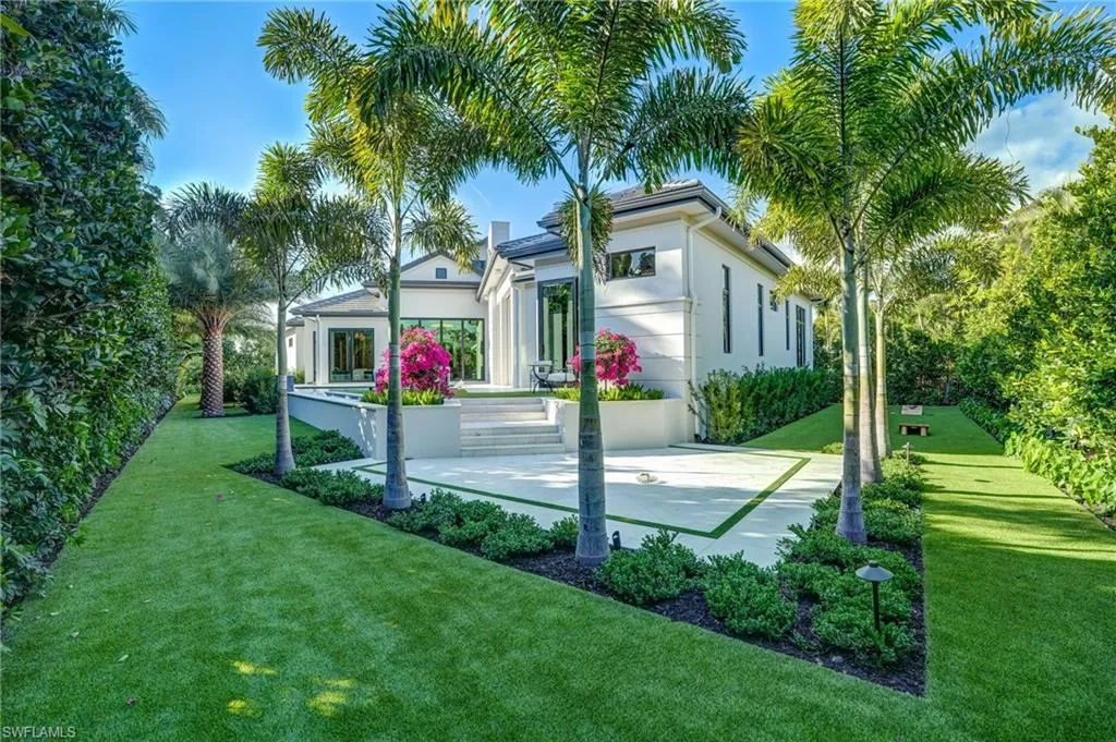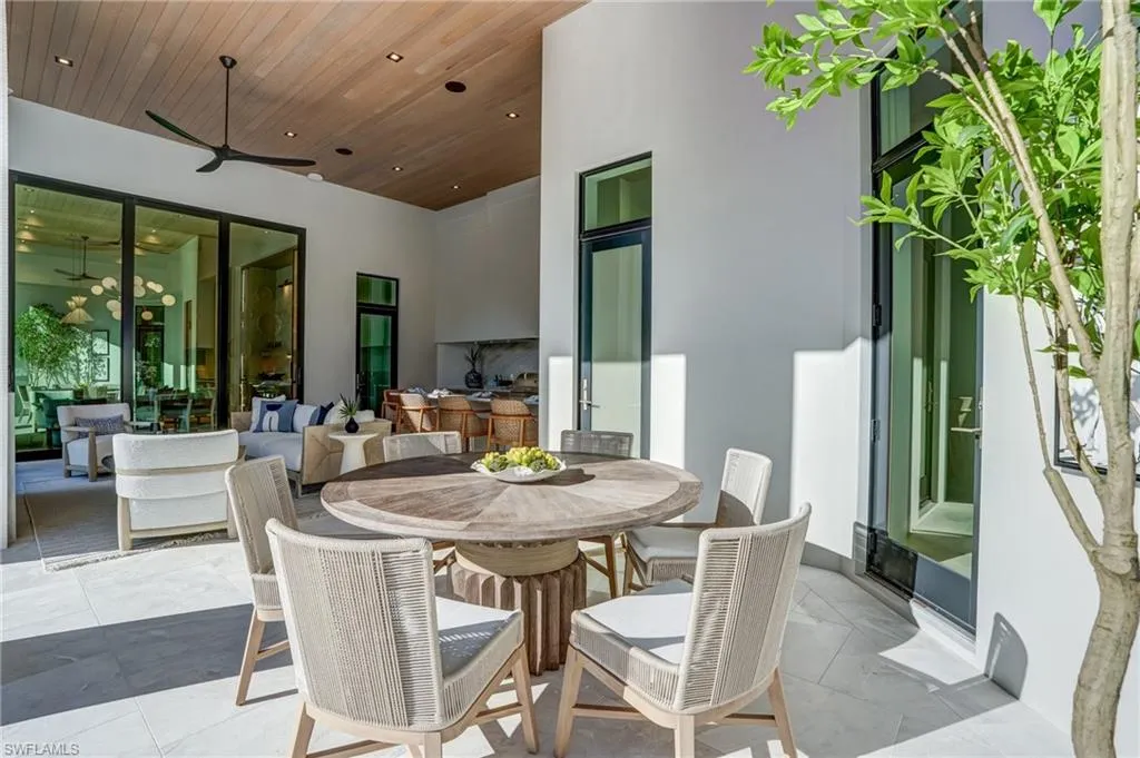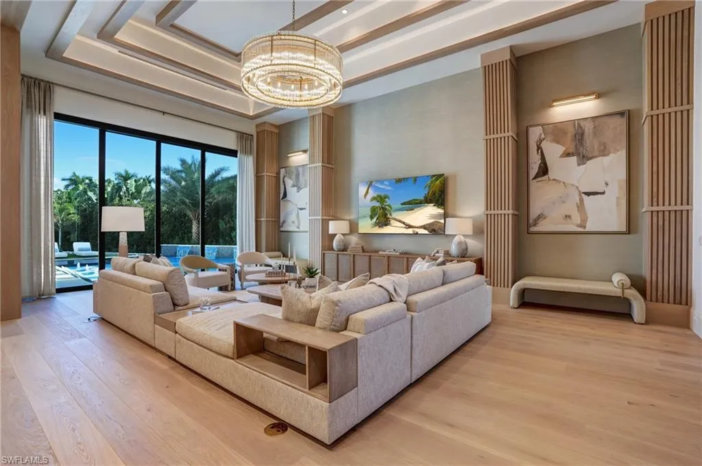 Introducing an extraordinary new construction estate in The Moorings—crafted by Borelli Construction, one of Naples’ longest-standing family-owned luxury builders. Designed by Unique Hite Designs with interiors and furnishings by R & Co. Designs, this single-level residence offers 5,156 square feet of impeccably curated living space on nearly a half-acre cul-de-sac homesite. A sense of arrival begins before entering the home, where custom water features and lush landscaping create a serene first impression. Inside, the home showcases European wide-plank white oak flooring, Samsung Frame TVs, Crestron Home automation, and a level of bespoke detail rarely found—every space thoughtfully layered with custom wall treatments, woodwork, or lighting selections. The floor plan features five en-suite bedrooms with fully built-out closets, plus a stunning home office wrapped in bleached walnut millwork with integrated LED lighting. The chef’s kitchen centers around a book-matched quartzite stone island with waterfall edges and includes a 60″ Wolf range with double griddle, full Sub-Zero refrigeration, a full-size wine column, and a butler’s pantry equipped with additional Wolf appliances. The primary suite is a private retreat with a sitting room overlooking the pool and tranquil backyard. Designer window treatments include hardwired, Crestron-integrated shades throughout. The outdoor living experience is exceptional. An oversized pool and spa with custom pebble finish, sun shelf with in-water loungers, expansive grassy yard, and a massive outdoor kitchen in the covered lanai, protected by retractable screens and hurricane shutters, create the perfect setting for relaxation and entertaining. Additional features include three garage spaces plus a dedicated golf cart garage, thoughtful storage, and a location moments from The Moorings Golf & Country Club and minutes to downtown Naples. A rare offering with unmatched craftsmanship and design—this home is truly one of one and an absolute must-see.