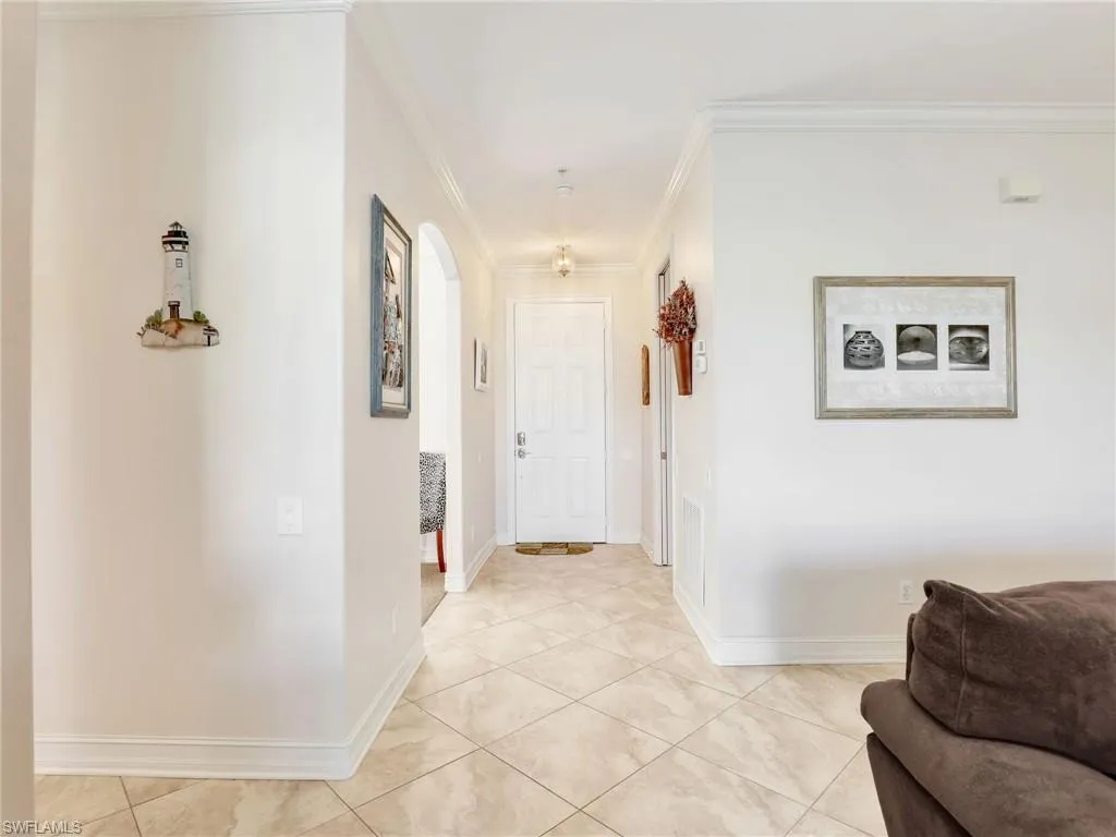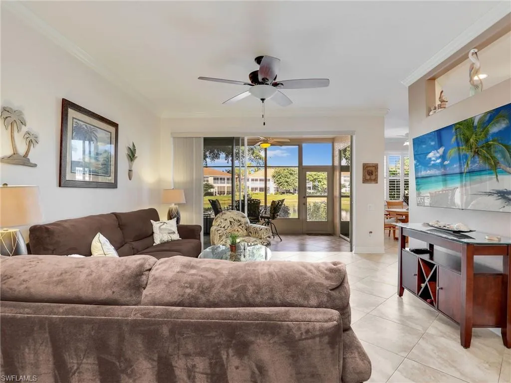 Discover effortless coastal living in this beautifully appointed 2-bedroom plus den, 2-bath first-floor residence located in the highly desirable gated community of Tarpon Cove. Enjoy tranquil water and fountain views from the enclosed lanai, which extends the living area and creates a peaceful indoor-outdoor retreat. A private entry breezeway welcomes you into the home, where comfort and style blend seamlessly throughout.