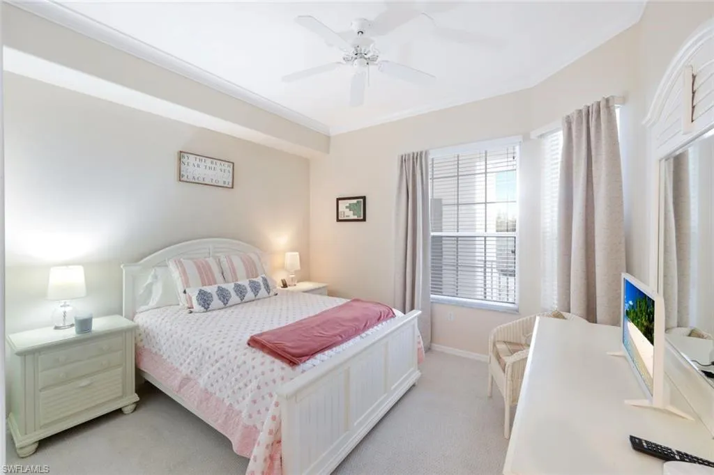 Amazing third floor tree top view of the 11th fairway. From a morning coffee, afternoon tea time to a happy hour libation, you will love the two sided oversized enclosed lanai that allows beautiful breezes to pass. You will feel at home with this furnished home with high ceilings, crown molding throughout, new carpet, tiled flooring and a coastal vibe feeling. Pocket doors lead to the den which is versatile as an office, to watch TV or for your overnight guests with a comfy pull out couch. The home has white kitchen cabinetry, a pantry, eat in kitchen nook, new KitchenAid appliances as well as a breakfast bar to be part of the cooking! This desirable building is one of the closest condo buildings to the clubhouse, amenities and satellite pool and is set back from the road with beautiful palm trees at its entrance.