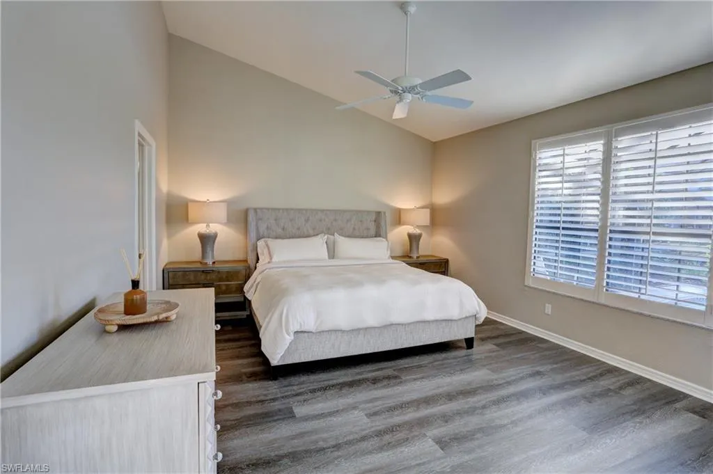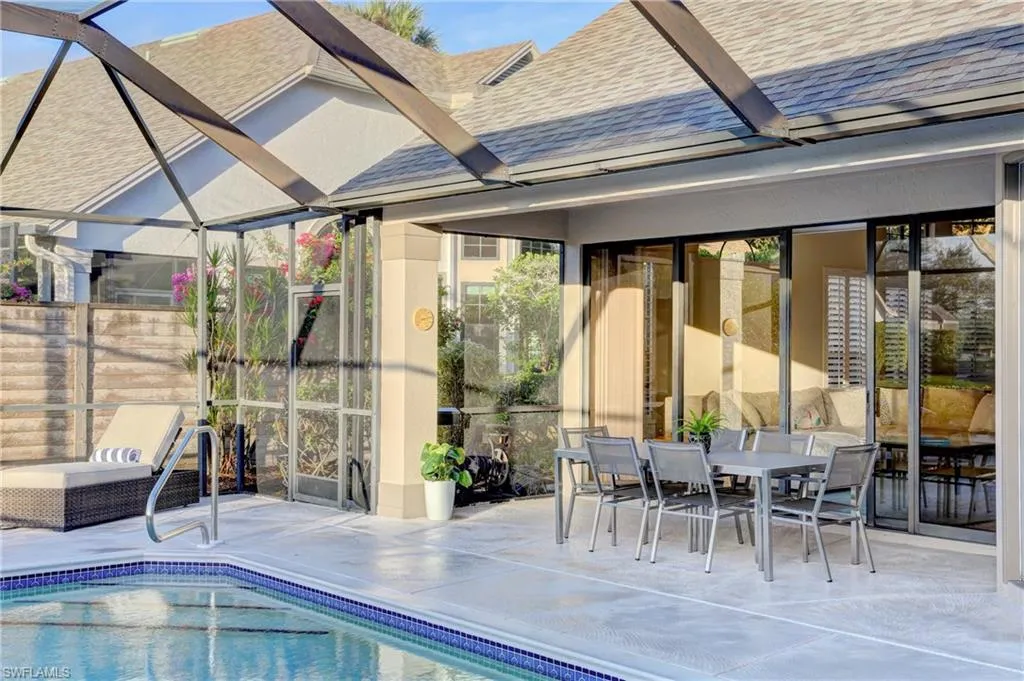 Welcome to this beautiful private retreat in the heart of Water Oaks, one of Wyndemere’s most desirable communities just steps to the club! This bright and airy attached villa lives like a single-family home, offering serene lake views and gorgeous sunsets over the water. The expansive screened lanai features a private pool, one of the few Water Oaks residences that offers this. The open floor plan flows effortlessly with soaring vaulted ceilings, abundant natural light and stylish finishes ideal for casual Naples living. The spacious main living room opens up to the lanai offering a great space for indoor/outdoor entertaining. The kitchen opens directly to a side patio with a privacy wall, another quaint private space for grilling or an evening cocktail. All bedrooms feature luxury high-end vinyl plank flooring, with the generous primary suite offering access to the lanai. Plantation shutters on windows add class and convenience. The entire interior was professionally painted with designer lighting installed throughout the kitchen, living room and bathrooms. Additional standout features include a brand-new hot water heater, freshly painted garage door, new roof and upgraded attic insulation, complete exterior painting, and custom built in California Closets. Two-car garage with tile flooring. Wyndemere, an award-winning 2025-2026 Platinum Club of America, offers unmatched amenities, including 27 holes of Arthur Hills golf, 10 HarTru tennis courts, pickleball courts with 165 stadium seating for pickleball pro exhibitions, active bocce teams, full croquet, a resort style zero entry pool, golf simulator, putting greens, driving ranges, 2 pro shops. A full-service spa, salon and state of the art fitness center with a full schedule of group exercise classes and personal training. Enjoy formal dining, as well as indoor/outdoor casual dining at the Tiebreaker, and a lively social schedule of events/parties at the club. Wyndemere, known for its friendly and welcoming membership, is ideally located within minutes to 5th Avenue world class dining, shopping and the spectacular sugar sand Gulf beaches. Live everyday like you are on vacation and come enjoy this amazing lifestyle!