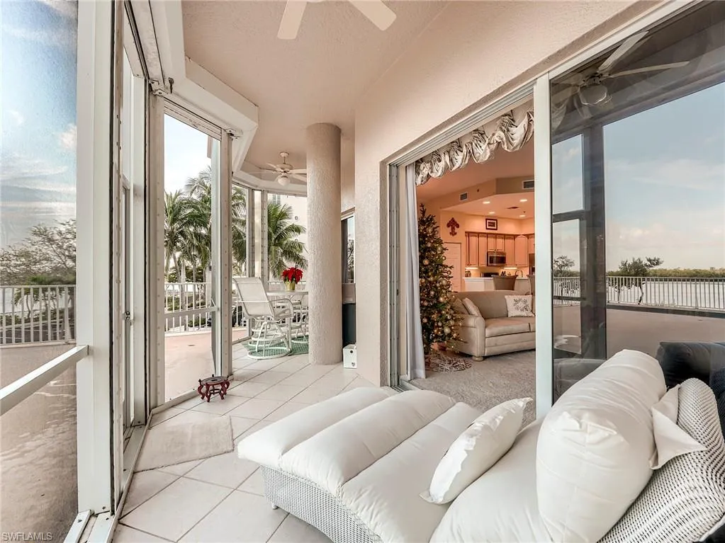 at Bay Beach located at the desirable south end of Ft. Myers Beach with exquisite views of the Intracoastal waterway with passing boats and occasional dolphins and manatees. Why is the second floor at Waterside 4 so unique? This unique second floor end-unit not only has exceptional, close to nature, views of the Intracoastal waterway from every room in the unit but it has two oversized private walkout decks one approximately 40×40 ft. in addition to the large lanai. This integrates the indoor and outdoor space to allow for extended activities and entertainment by all ages. Patio tables , chairs and lounge chairs with cushions are included. As an end unit ,natural light streams through the additional side windows offering stunning views of the water and the fishing pier. All three bedrooms have 8ft sliding glass doors and provide access to the outdoor decks. The master bedroom has a larger sliding door with 3 panels of glass and a walk-in closet and ensuite bath with separate bath and shower. All 3 bedrooms have wall mounted TV’s. This unique second floor unit also features 11ft ceilings found only here and in the penthouses ,creating an exceptional sense of space. As a result it also allows for extended cabinetry for extra storage and extended height in the screened-in lanai which can be completely enclosed with the electric hurricane shutters. Yes there is more on the second floor. Located down the hall are two guest suites, well equipped gym, social room with adjoining kitchen, sauna and showers thereby providing unmatched convenience for hosting. Easily accessible down one floor are the outside amenities which