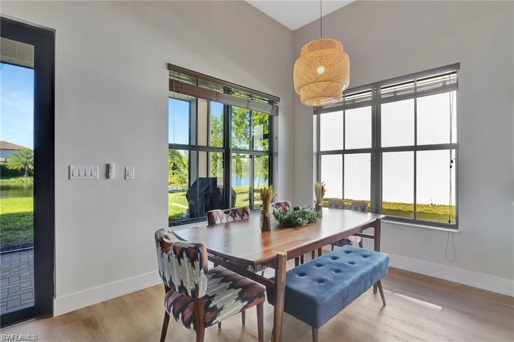 Amazing Brionnes model comes to market! Must see this well appointed and expansive mediterranean elevation 4 bedroom and 3 bath home situated on a lakefront lot in sought after Maple Ridge. Once you enter this home you are greeted by seperate formal dining and living room. Custom wood plank flooring throughout leads you to the entertaining space of the kitchen and family room. The kitchen features upgraded appliances, custom granite counters, modern white shaker style cabinets and walk-in pantry. This home features 10-12 ft ceiling heights making the space larger throughout. Bedrooms are a split floorplan with 3 bedrooms and 2 baths in one section and the master bedroom and bath in the other. Master bedroom features large windows overlooking the lake views and is connected to 2 walk-in closests and the master bath featuring seperate tub/shower and dual sinks. Enjoy the SW Florida weather with a screened in lanai as you enjoy beautiful lake views. As a resident in Maple Ridge, you will have access to the Club at Maple Ridge, the multi-million dollar ameneity clubhouse with pool, play area, walking path, party room, gym, steam sauna, dog park, billiard, poker/game room and more! Additional amenitites include waterpark, bike/jogging paths, town gym, sports parks, playgrounds, tennis, pickleball, shopping and restaurants.