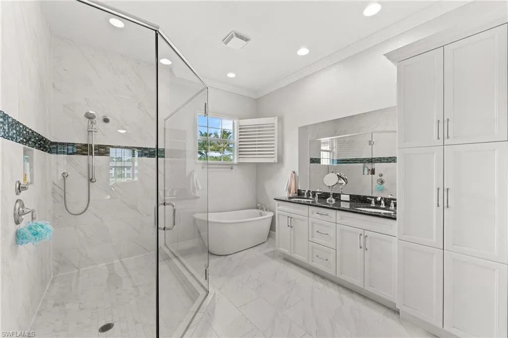 The chef’s kitchen is spectacular, boasting white cabinetry, quartz countertops, stainless steel appliances, a wall oven, and natural gas cooking. A large island and formal dining area flow seamlessly into the spacious living room, where glass sliders open to the serene lanai with stunning water views. The outdoor living space is protected by impact-resistant enclosures and remote-controlled Storm-Smart shutters.
