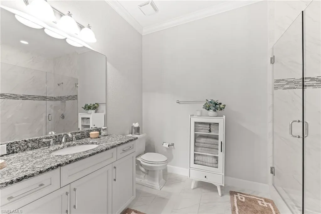 Rarely Available Luxury! Experience the pinnacle of resort living in this meticulously maintained, second-floor St. Andrews model at Lely Resort’s exclusive Signature Club. Built by Stock Development in 2015, this highly desirable 2,738 sq. ft. condominium is an entertainer’s dream, featuring four bedrooms, 3.5 baths, and a private elevator. Step inside a light-filled, private haven surrounded by lush magnolias and palms. The grand foyer sets a luxurious tone with a 19-foot ceiling, custom chandelier, and tray ceiling. Throughout, you’ll find elegant finishes like crown molding, recessed lighting, white plantation shutters, and beautiful vinyl flooring.