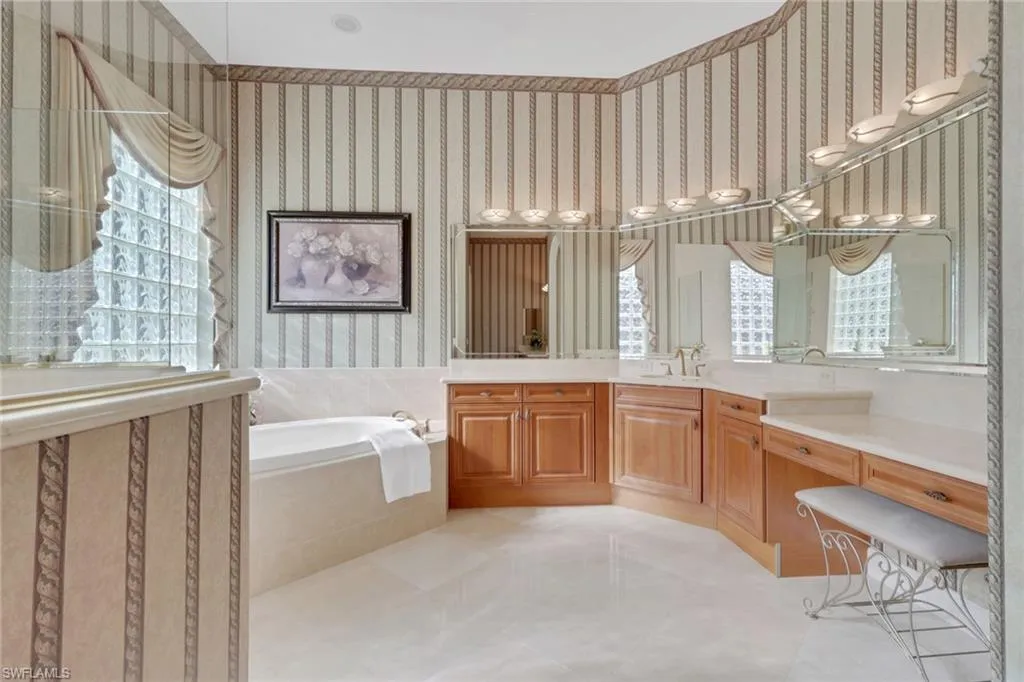It’s exceptional and rare when a home’s design strikes a perfect balance of privacy, effortless flow for entertaining and versatile use of traditional living space. This estate size cabana home in Glen Lake Estates in Vineyards does just that! The home’s design wraps around the heated pool with a terraced paver deck and privacy wall featuring a custom painted mural – your own private, sun-drenched oasis! The main living area blends the kitchen, dining and living spaces, ideal for everyday living and memorable gatherings. The kitchen is the hub of the informal family room/breakfast nook where comfort and conversation are natural. Just off the kitchen are the formal and dining rooms – currently where a tropical bar and pool table reside…what fun! Spacious primary suite features a walk-in shower, jetted tub, dual vanities and two generous walk-in closets, along french door access to the pool area – a personal sanctuary designed for self-care and retreat. Marble flooring extends throughout the main living area elevating the living space while being amazingly durable. The self-contained cabana suite further defines versatility. Complete with large main room, walk-in closet and a full bath (which also serves as pool bath), it’s perfect for guests to use, or for a home office, fitness or yoga studio, art/craft room, or a private retreat – whatever suits your lifestyle. Come see this home for yourself soon!