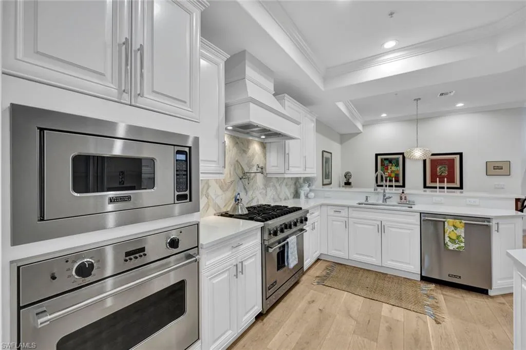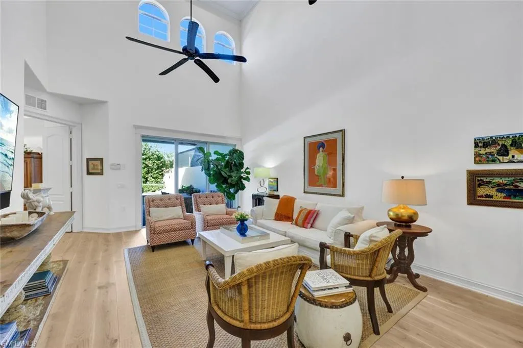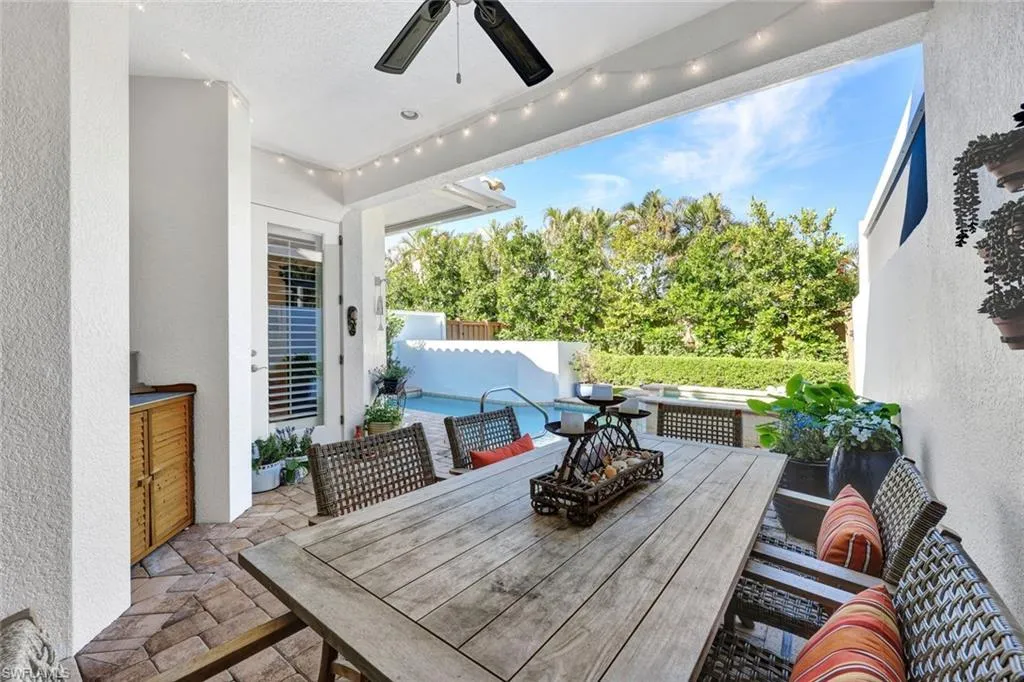 Exceptional location, living space size, elevation… and price! Luxurious Park Shore townhome with over 3200 SQUARE FEET of living space, this stunning 3 bedroom plus den residence combines the ease of villa living with the privacy & space of a single-family home. Perfectly situated and recently renovated on a serene private cul-de-sac, it is just moments to the beach, as well as upscale shopping and dining. The beach, Waterside Shoppes, Venetian Village, and Artis-Naples are moments away, as well as Seagate Park with its tennis courts & playing fields. The open floor plan flows seamlessly through living spaces adorned with volume tray ceilings, crown molding, solid wood doors, fresh paint, and newly installed Legno Bastone Italian wide plank wood floors throughout the home. The great room boasts 25′ ceilings and expansive windows filling every corner of this home with natural light. The triple sliding impact glass doors open to a spacious, lush and private lanai, featuring a sparkling heated pool and spa, a new privacy fence, landscaping & night lighting, all perfect for relaxation or entertaining. The newly renovated gourmet kitchen is a chef’s dream, featuring solid wood cabinetry, white quartz countertops with a marble backsplash, and a full suite of Viking appliances, including a 6-burner gas range with a pot filler, a wall oven, convection microwave, and built-in refrigerator. In addition to a formal dining room, this level has a spacious office perfect for the remote worker. This main floor also includes the luxurious primary suite with newly installed closet organizers and a sumptuous bathroom retreat with a separate soaking tub, his/her vanities and large shower. A private elevator provides convenient access to the spacious second level with soaring tray ceilings. Here, you’ll find a media room, family room or second office complete with new built-in bookshelves and cabinets, a wet bar and wine cooler. Two large guest bedrooms with renovated en-suite bathrooms allow privacy and comfort for family and friends. There is plenty of storage throughout the home, but this level has an extra large storage closet plumbed for secondary laundry machines for added convenience. THIS VILLA IS LOCATED IN AN X ZONE ELEVATION AREA – with no water intrusion from any prior storms. Lusso Villas has a condo association of 5 townhouse units with strong reserves. This summer, all units have been freshly painted, new exterior lighting installed, new landscaping installed, and new iron gates in front of each unit have been installed. All this was done with NO ASSESSMENT. THESE FEES COVER PROPANE GAS, WATER, SEWER, LAWN MAINTENANCE, IRRIGATION, INTERIOR AND EXTERIOR PEST SERVICE, ROOF MAINTENANCE, EXTERIOR WINDOW WASHING, EXTERIOR PAINTING, PAVERS, INSURANCE, MANAGEMENT, & RESERVES. This exquisite home seamlessly combines refined elegance, thoughtful design, & an unbeatable location—all with the added convenience of an effortless “lock and go” lifestyle.