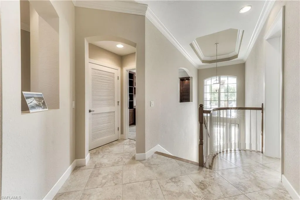 This Oversized Northern Exposure Upper Unit Four-Plex Coach Home offers 3 Ensuite Bedrooms Plus Den. The Split Bedroom Great Room Floor Plan Lives Like a House. With 2,748 SqFt under air plus Impact Glass Sliders on 233 sq ft Lanai offers an endless view… making the condo feel even larger. The oversized 2 car garage with individual doors also has 2 closets for storage. One of the closets is below the closet in unit which was designed for an elevator if you’d like to add one. The large kitchen also has great cabinetry & storage. It is accessible to the great room, morning room & lanai making it the heart of the home. Notice the many recessed lights & 7″ Crown Moulding, it is everywhere as are the 4″ Wooden Plantation Shutters. 20″ tiles laid on the diagonal are in all main living areas & lanai. The Den has ‘real’ hard wood floors. All upgraded cabinetry hallmark the coordinated effort of this original home owner who chose the interiors with the builder design team. The Great Room can have many configurations for relaxing lifestyle living. The spacious Primary has its own door to lanai with the show stopping view. The lanai offers the sought after panoramic view of trees, lakes, the 5th hole of the North Course & awesome sunsets. Don’t miss seeing this wonderful unit with spectacular views.