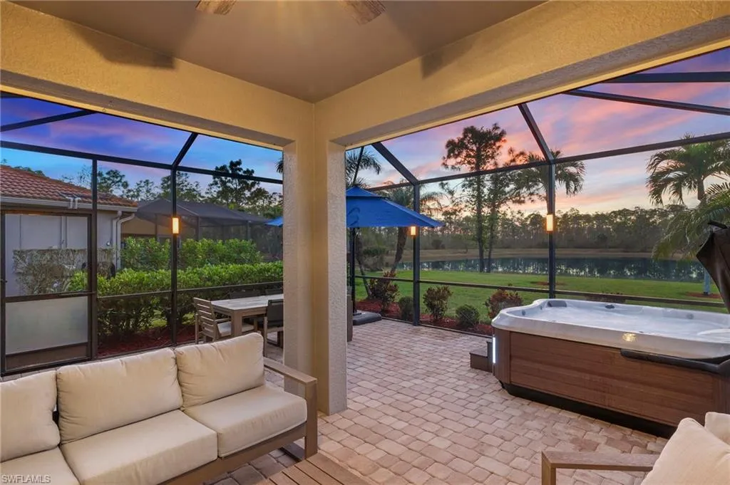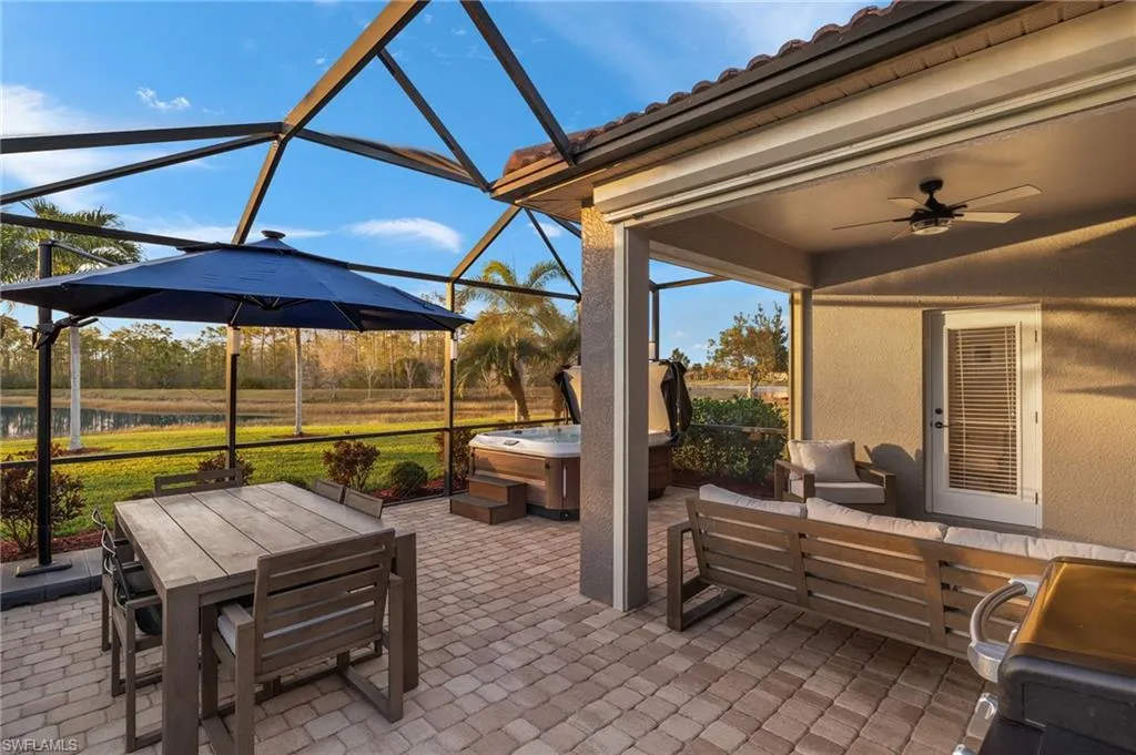 Look no further! This FURNISHED dream property, in the heart of Estero, boasts 3 bedrooms and 2 baths situated on a peaceful culdesac with stunning lake views. The Florida Mediterranean exterior showcases arches, stone masonry accents, a wrought iron screened entry and a tile roof that invites you in. As you enter into the home, you pass through an upgraded decorative glass front door that leads to an open foyer with impressive ceilings and crown molding throughout. The beautifully finished kitchen, equipped with NEW appliances, has an open concept feel that looks out onto the formal dining room. The kitchen offers ample cabinets and counter space, giving the culinary enthusiast plenty of room for storage and cooking! The kitchen feels like a day out at the café with the built in booth, quartz countertops, decorative backsplash and great natural lighting. This house has the perfect sized living room with ample seating space and decorative beams to give the home an elevated look. The gathering room looks out onto the gorgeous lake view and large covered lanai. Stepping outside you will find an extended screened in patio with to enjoy all of the wildlife views while you soak up the fresh air in the included above ground spa! The owner’s suite shares these incredible views along with an impressive primary bathroom. The bathroom offers a garden tub and a glass enclosed tile shower with a double bowl vanity. The two secondary bedrooms offer flex space for family, guests, office needs and more. The garage has a newly epoxied floor, hanging ceiling racks, a second refrigerator, and a portable generator. If you are looking for a beautifully furnished home with newer Samsung appliances/TV’s throughout, freshly painted, move in ready with plantation shutters, aesthetic improvements, gorgeous views and space for recreation -look no further! Do not miss your opportunity to own this gorgeous home in a prime location. Bella Terra is a one of a kind community located just a few miles east of I-75 in Estero, off of Corkscrew Road. Bella Terra has lower HOA costs compared to other communities nearby while providing landscape maintenance, cable, internet, 24-hr gate guard, and more. This community is the perfect blend between amenities and nature with breath taking views of the 100 acres of beautiful lakes and the surrounding 400 acres of conservation preserves. Bella Terra amenities include a 7,000 sq. ft. Club House, with a fitness center, a resort style pool with a spa and waterfall, pickleball, tennis, bocce, & basketball courts, multi-use ball fields, an inline skate park, beach volley ball, butterfly garden, and playground.