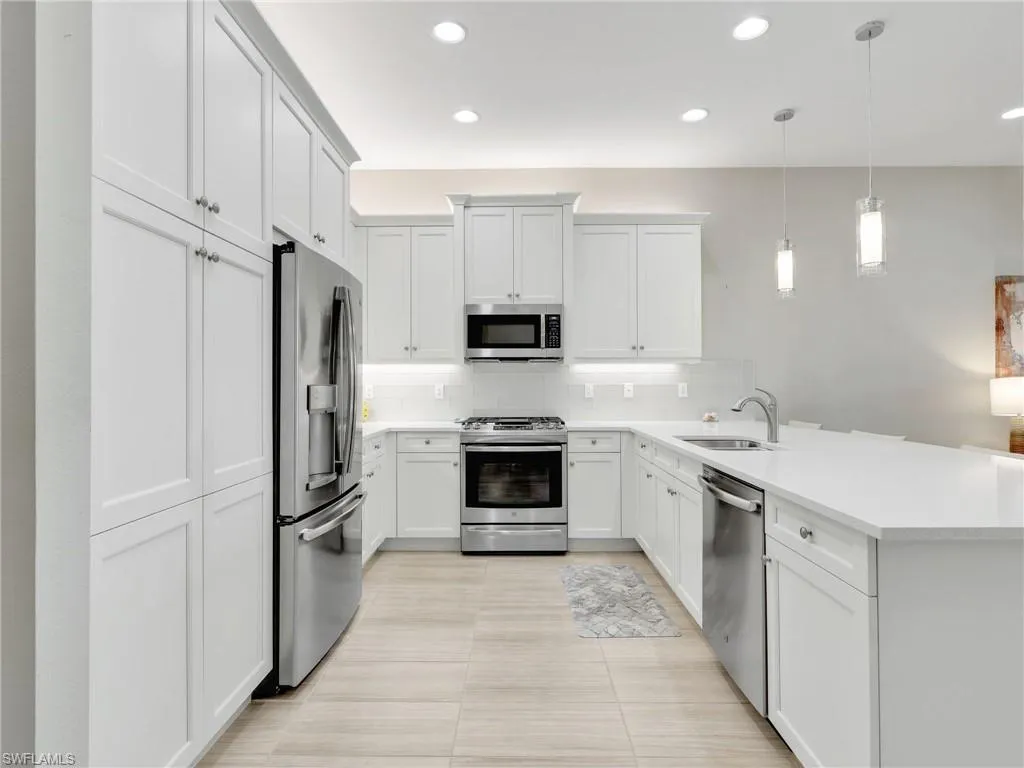The all-white kitchen features a gas range, a spacious built-in pantry, and countertop-height bar seating—perfect for casual dining or entertaining. Enjoy peaceful Florida sunrises from the screened-in lanai, an ideal spot to relax and stay cool throughout the day.