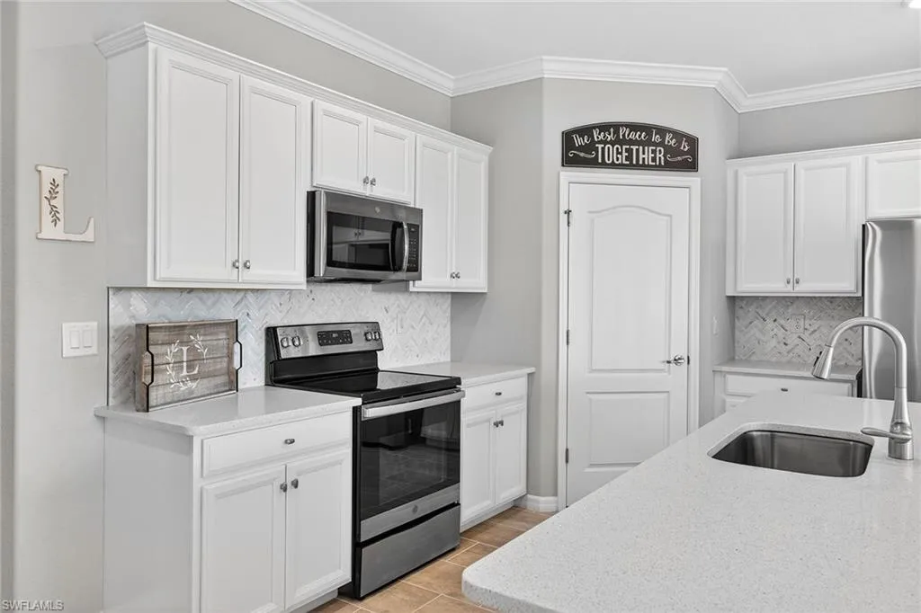At the heart of the home, the open-concept kitchen has been thoughtfully updated with quartz countertops, a marble backsplash, a single-basin sink, and a spacious walk-in pantry. The kitchen seamlessly connects to the dining area and family room, offering a layout ideal for entertaining or everyday comfort. Crown molding and 12-by-18-inch porcelain tile flooring extend throughout the main living spaces, adding to the home’s elegant, cohesive feel.