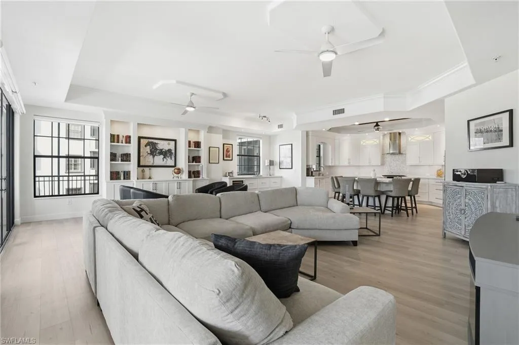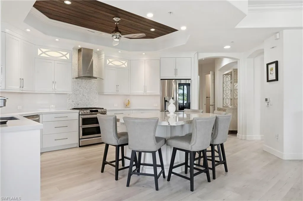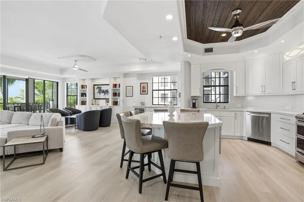 Step inside to a fully updated, modern coastal retreat featuring an expansive open-concept layout, elevated finishes, and abundant natural light. The redesigned gourmet kitchen showcases custom cabinetry, quartz countertops, premium appliances, and an extended island—ideal for entertaining a perfect chefs kitchen. The spacious great room flows effortlessly to the screened waterfront lanai, creating a seamless indoor–outdoor living experience.