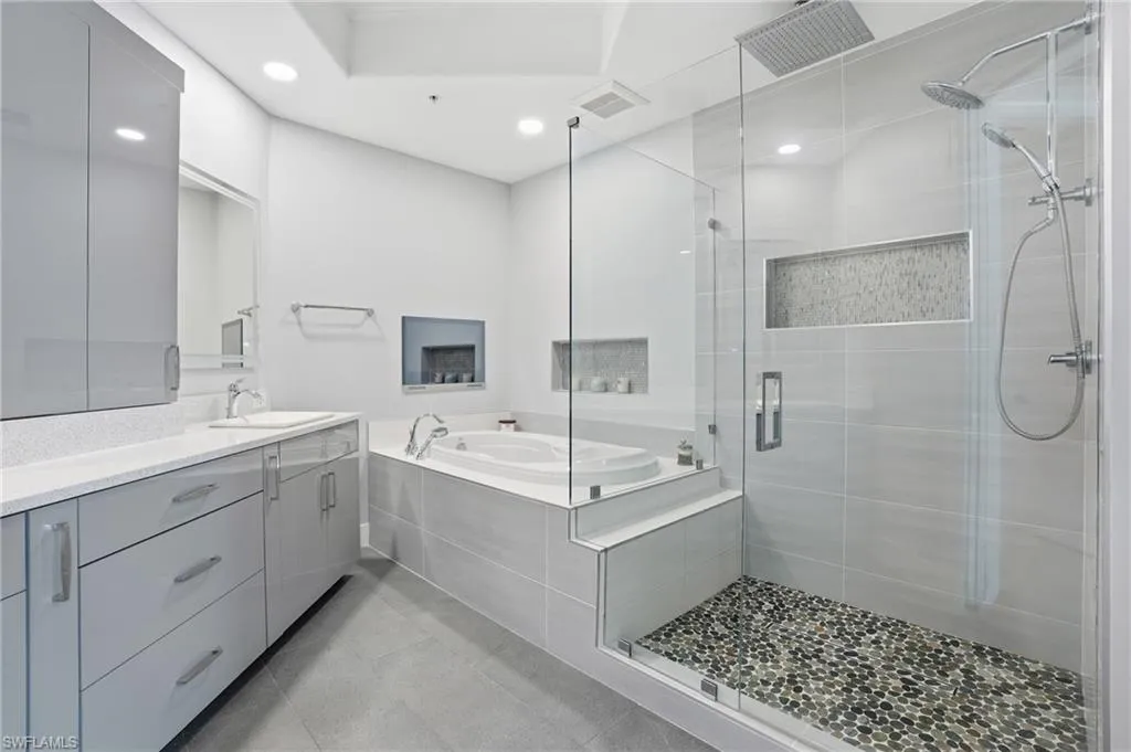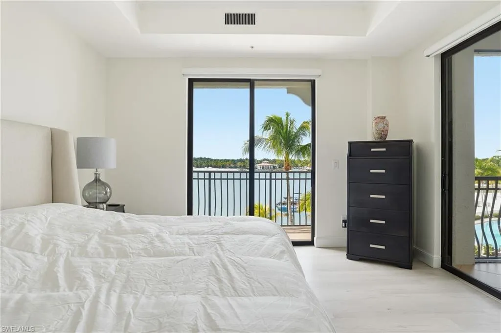 The elegant primary suite offers serene lake views, a renovated spa-inspired bath, and generous walk-in closet space and private balony. Additional enhancements include upgraded flooring throughout, refreshed guest spaces, updated lighting, and a modernized laundry room.