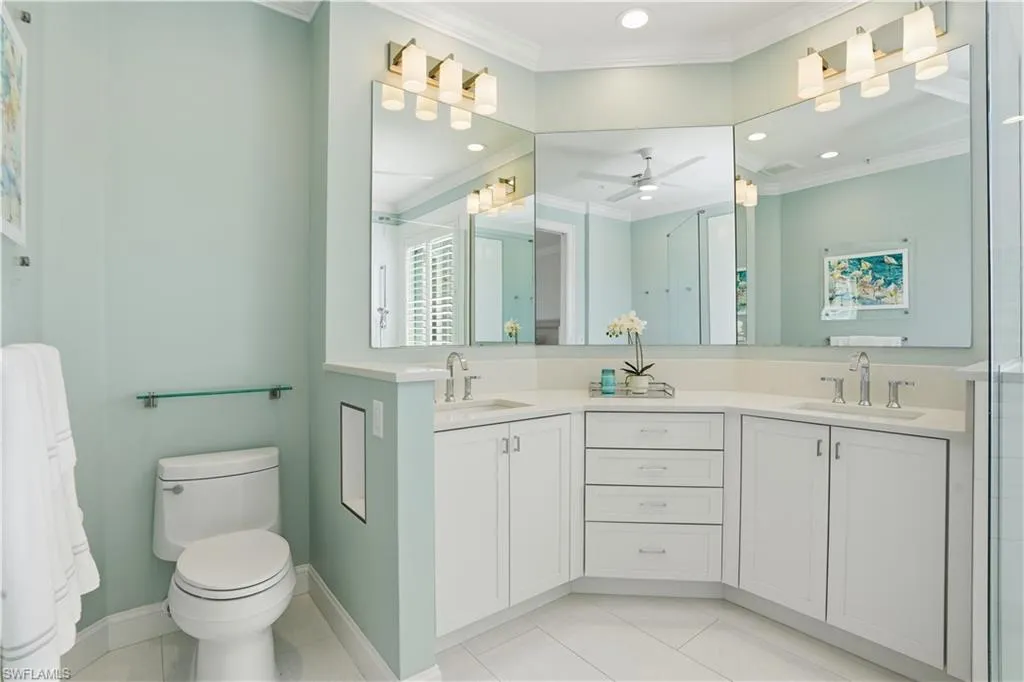 Impeccable craftsmanship and thoughtful detail define the home’s interior. The stunning chef’s kitchen showcases custom glass-lit cabinetry, striking quartzite countertops, high-end appliances, and a wine refrigerator—designed for both beauty and functionality. Both bathrooms have been completely reimagined with luxurious, spa-inspired finishes. Additional enhancements include crown molding throughout, new fans and recessed lighting, and a newer HVAC system.