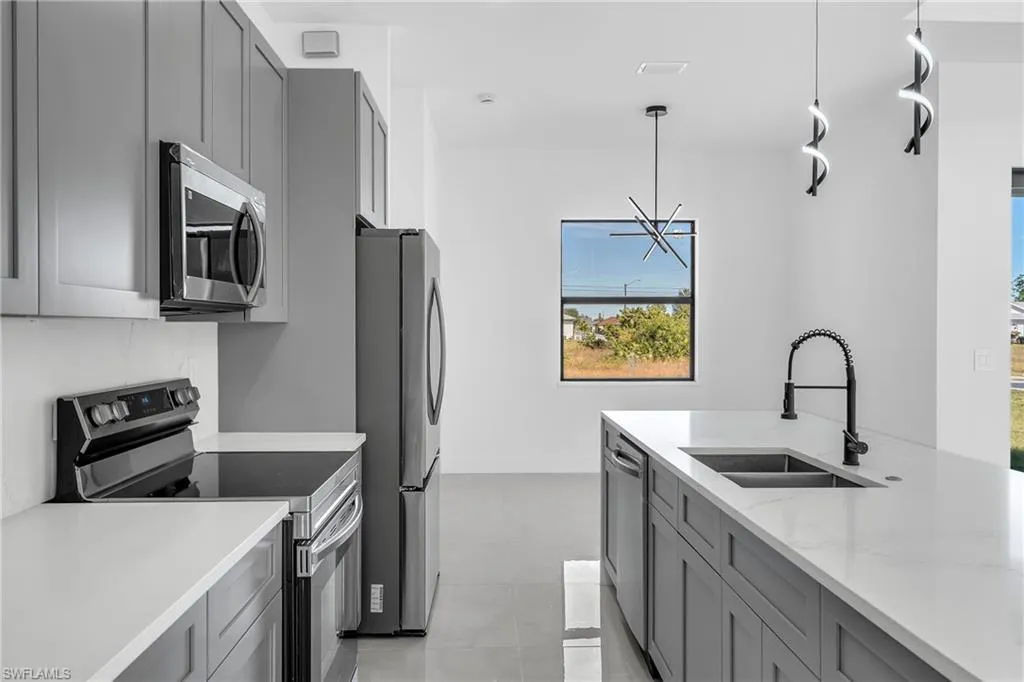 Introducing this beautiful new construction home located in the heart of Lehigh Acres, offering 4 bedrooms or a flexible 3-bedroom + den layout and 3 full bathrooms. This residence features stunning quartz countertops, a waterfall kitchen island, tray ceilings, recessed lighting, and porcelain tile flooring throughout. The master suite includes a dual sink vanity and a luxurious waterfall shower head. Impact-resistant windows and doors provide added security and energy efficiency. This property is one of four identical new-construction floor plans available from the builder. This home is ready for offers and a new owner! *Interior photos are from an identical floorplan/model the builder has available 3400 14th st sw – updated photos will be up soon!*