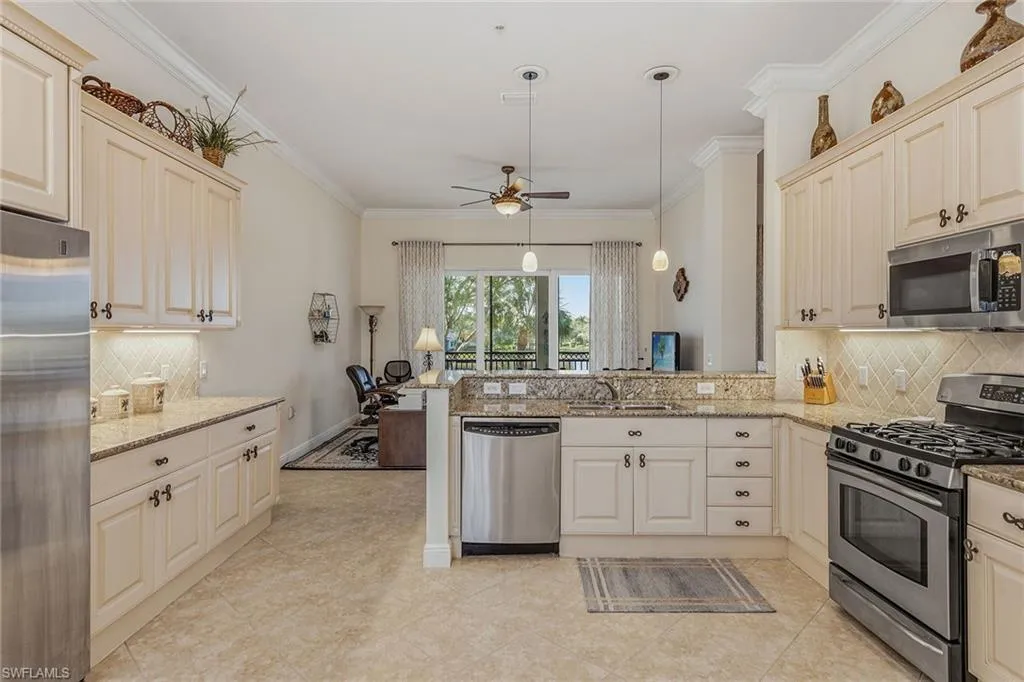 Experience bright southern exposure and stunning expansive lake views surrounded by lush, tropical landscaping in this beautifully maintained second-floor residence in the popular Laguna neighborhood in the highly coveted Fiddler’s Creek community. Filled with natural light and designed for effortless indoor-outdoor living, this spacious three-bedroom, three-full bath home offers a generous layout with soaring ceilings, impact doors and windows, and an expansive lanai that creates a serene retreat overlooking peaceful water views and palm trees. An attached two-car garage enhances everyday convenience, while the home’s elevated position provides exceptional privacy, sunlight and an inviting sense of openness throughout. Inside, diagonal tile flooring flows through the main living areas, complemented by crown molding and abundant windows that frame the lake. The kitchen is both stylish and functional, featuring granite countertops, a tile backsplash, recessed lighting with under-cabinet accents, a breakfast bar counter, pantry, and stainless-steel appliances including a natural gas range, newer microwave, refrigerator with ice maker, and dishwasher. A cozy dining area sits beside a large window, creating the perfect morning breakfast spot. The formal living room, with an adjoining dining area, and the family room each offer glass sliders that open to the oversized screened lanai. A large covered outdoor living area, tile flooring, and dual ceiling fans enhance year-round enjoyment. The owner’s suite is a peaceful waterfront sanctuary with beautiful lake views, private lanai access, and two walk-in closets with wood-slat shelving. The en-suite bath features a dual sink vanity with a full-width mirror and makeup counter, a walk-in shower with glass enclosure, and a separate soaking tub. The spacious first guest bedroom offers double-door entry, arched windows with white plantation shutters, and an en-suite bath with a walk-in shower that also provides convenient hall access. The second guest bedroom is equally inviting with its own en-suite bath featuring a walk-in shower with glass enclosure. A well-appointed laundry room includes a storage closet, built-in ironing board, utility sink with granite and mosaic tile backsplash, overhead cabinetry, and an LG top-load washer and LG front-load dryer, both newer, for added convenience. Additional upgrades include a tankless water heater, contributing to efficiency and enhanced comfort. Residents of Fiddler’s Creek enjoy ample options for walking and bicycling, and world-class recently-renovated amenities, including a state-of-the-art fitness center, 6 tennis courts and 10 brand new pickleball courts, bocce, spa services, sauna, steam room, hot tub, fine and casual dining, and a spectacular resort-style pool with waterfalls and slides. Optional memberships for golf, beach, and marina access further elevate the lifestyle, with a brand-new golf clubhouse and a recently renovated golf course.