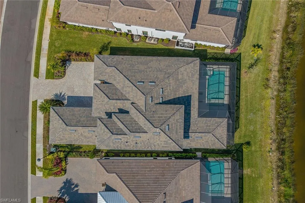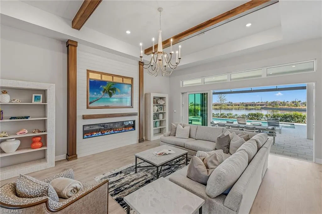 Discover a striking blend of contemporary style and wide-water serenity in this newly completed, fully beautifully furnished and highly upgraded two-story residence in the extremely popular Esplanade by the Islands community. Better than brand new, completed in 2024, this exceptional home was thoughtfully crafted to take full advantage of its expansive lakefront setting, offering sweeping water views from nearly every room. Enhanced with upgraded landscaping, custom lighting, and refined architectural details, it presents an impressive presence from the moment you arrive. With four bedrooms plus a den, four full and two half baths, and a three-car garage, the layout is designed to accommodate both luxurious living and effortless entertaining. Dramatic double-entry doors introduce a light-filled open-concept interior highlighted by elegant volume tray ceilings, designer lighting, transom windows, and extensive millwork. The great room serves as the heart of the home, featuring a shiplap accent wall, built-in fireplace, and pocketing sliders that open seamlessly to the lanai. The chef’s kitchen blends beauty and function with white cabinets, quartz counters, in- and under-cabinet lighting, GE Café stainless appliances, including a natural gas cooktop with pot filler, and a convenient pass-through window to the formal dining area. A spacious island with pendant lighting and the adjoining dining space create an inviting atmosphere for gatherings. French doors lead to the den, a comfortable flex space highlighted by a shiplap feature wall. The primary suite, positioned for privacy, captures tranquil pool and lake vistas and offers direct lanai access, dual walk-in closets, and a spa-like bath complete with a soaking tub, quartz vanities, and a frameless shower. Two additional bedrooms on the main level each feature walk-in closets and their own en-suite baths, with one suite conveniently opening to the pool area. The second floor adds a generous bonus living space ideal for entertaining, highlighted by a sleek wet bar outfitted with quartz counters, a mini refrigerator, microwave, dishwasher, and sink. A powder bath and private guest suite with its own full bath complete the upper level. Outdoor living is one of this home’s most impressive elements. A panoramic screen enclosure frames the expansive lakefront pool and spa area, showcasing a beautiful pool with a sunshelf, and a spacious covered seating area ideal for relaxing or entertaining. The lanai also offers a designated hookup for a future outdoor kitchen, providing the flexibility to customize the space to your ideal alfresco dining experience. Additional features include impact windows and doors, a tankless water heater and three air handlers. Esplanade by the Islands is known for its exceptional amenities such as resort-style pools, pickleball and tennis courts, a state-of-the-art fitness center, a salon and spa, and poolside dining at The Bahama Bar, with the Culinary Center coming soon.