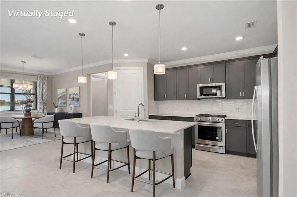 CENTER-OF-THE-LAKE WATERFRONT HOME WITH GORGEOUS SUNSET VIEWS IN VERDANA VILLAGE. Positioned on one of the community’s most desirable big-water lots in the completed Village, this extensively upgraded Pulte Mystique offers peaceful, no-construction surroundings and wide western exposure for unforgettable sunsets, with plenty of room to add a custom pool. Designed for both everyday living and entertaining, the open layout features 3 bedrooms plus a den, 2 baths, and an extended great room that enhances the home’s spacious feel. The den with French doors provides flexible space for a home office, media room, or additional guest area. Upgrades elevate every detail, including crown molding, gray soft-close dovetail cabinetry, 8-foot coastal-style doors, tray ceilings, ceiling-height shower tile, and a finished laundry room with cabinets, sink, and upgraded washer and dryer. Enjoy a 4-foot extended garage with epoxy flooring, outdoor kitchen pre-plumbing, premium window treatments, upgraded lighting with dimmers, whole-home water conditioning, enhanced A/C with UV air purification, Storm Smart hurricane shades on the lanai, hard-wired security system, and screened front entry. Massive amount of upgrades add comfort, convenience, and peace of mind. Enjoy true resort-style living in Verdana Village with indoor and outdoor pickleball and tennis, multiple pools, fitness centers, bocce, a covered playground, on-site dining, and a full social calendar. Opportunities like this are rare in Verdana… a like-new upgraded home on a premier center-of-the-lake lot, and sunset views that simply cannot be replicated. Don’t miss it. Most of the best big water lots are gone! One or more photo(s) has been virtually staged, AI generated or rendered.