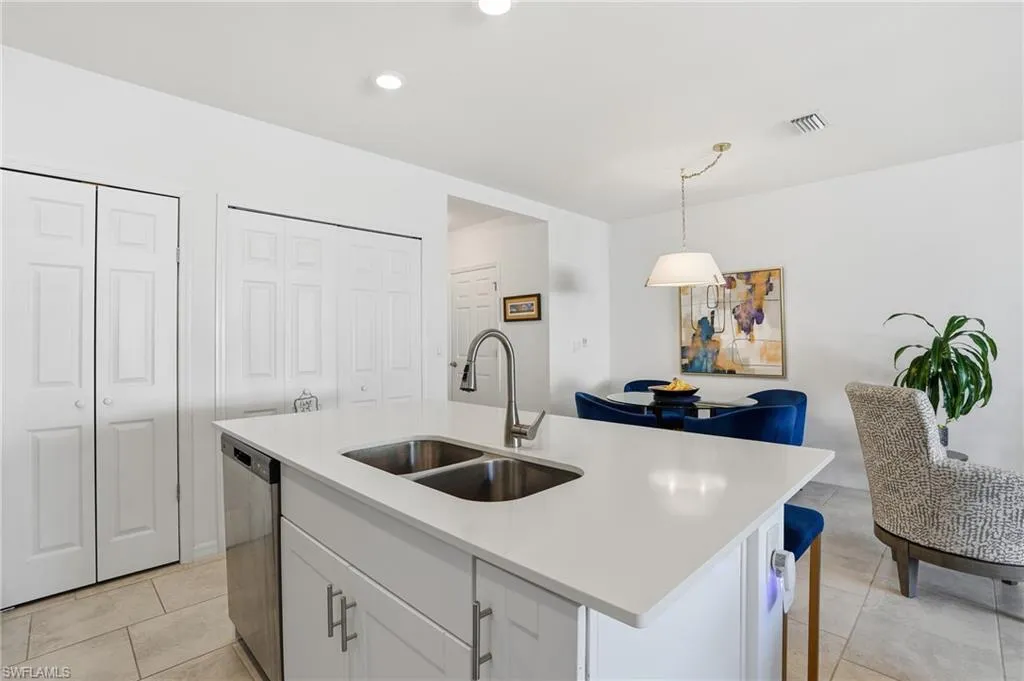 The kitchen includes an island with bar seating, walk-in pantry, and flows directly into the dining and living spaces. Upstairs, the primary suite includes a walk-in closet and ensuite bath with dual sinks and a walk-in shower. Two additional bedrooms and a full bath complete the second floor. Outside, the home features an attached garage, fenced area, and a private entrance. Portico residents enjoy access to a community pool, clubhouse, fitness center, basketball courts, pickleball, tennis, playground, and walking paths all with a low monthly HOA and a central location convenient to I-75, downtown Fort Myers, and local dining. This move-in ready townhome is ideal for year-round living, seasonal use, or rental investment.