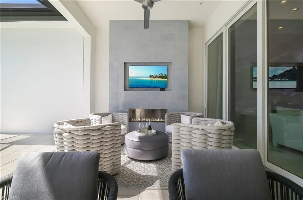 A stunning modern residence in the prestigious Miromar Lakes Beach & Golf Club, designed for effortless luxury living with an open, thoughtfully crafted floor plan and an unbeatable location. This beautiful home offers three bedrooms, a den, and three-and-a-half baths, with an expansive great room that flows seamlessly to a covered lanai featuring a fully equipped outdoor kitchen and fireplace—perfect for alfresco dining, entertaining, or relaxing sunset evenings at home. An EV charger adds modern convenience to its impressive list of features.